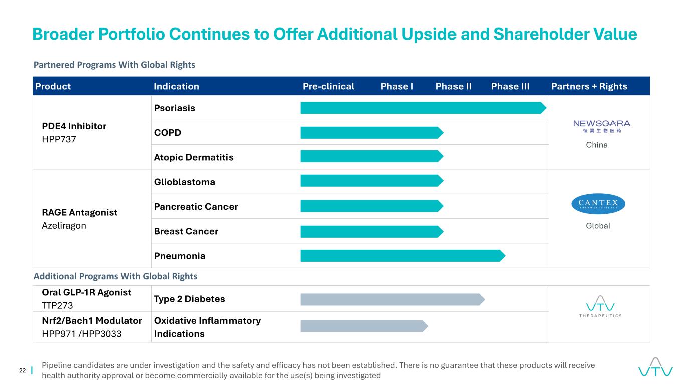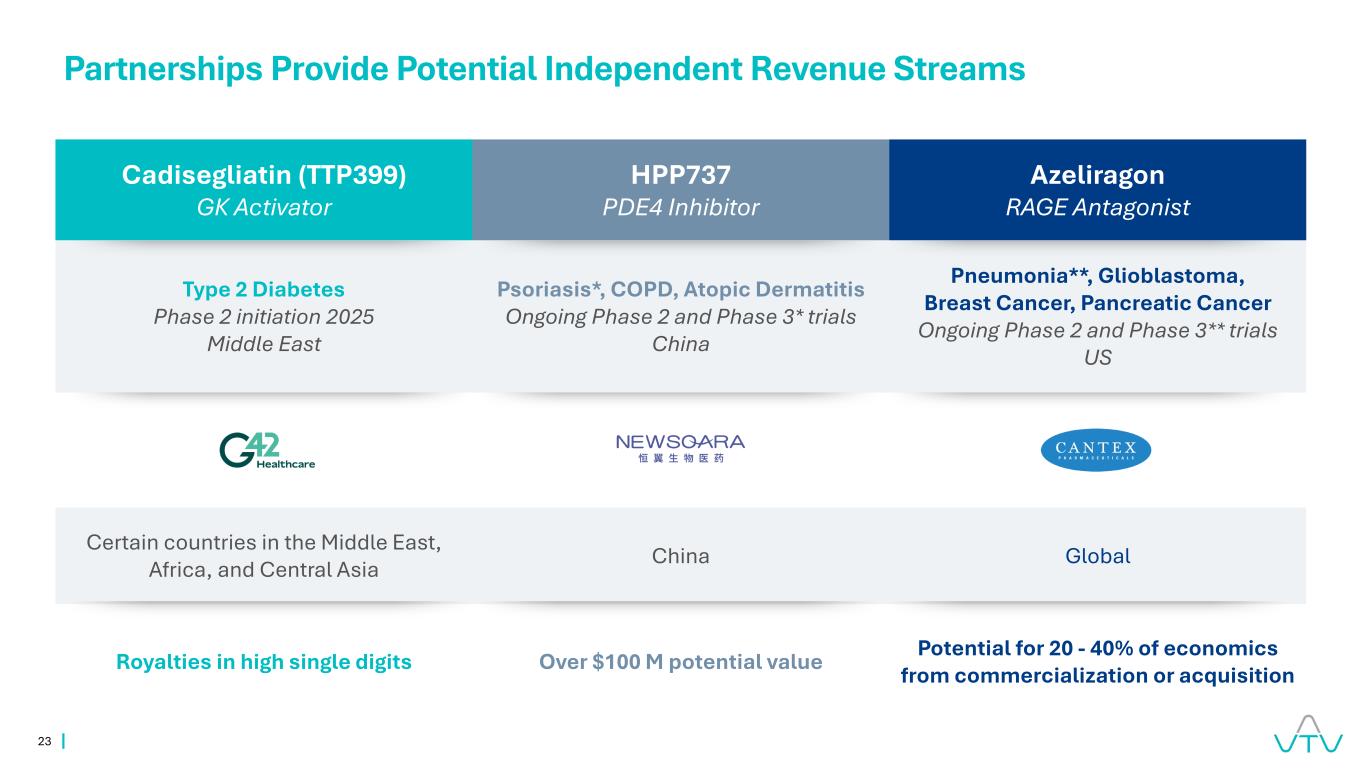 22产品适应症临床前I期II期III期合作伙伴+权利PDE4抑制剂HPP737银屑病COPD特应性皮炎RAGE拮抗剂Azeliragon胶质母细胞瘤胰腺癌乳腺癌肺炎口服GLP-1R激动剂TTP273 2型糖尿病NRF2/Bach1调节剂HPP971/HPP3033氧化性炎症适应症更广泛的产品组合继续提供额外的上行空间,股东价值管道候选者正在研究中,安全性和有效性尚未确立。无法保证这些产品将获得卫生当局的批准或可用于被调查的用途与全球权利中国全球合作计划与全球权利
