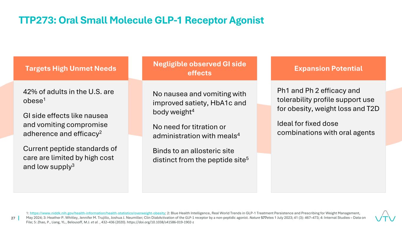 26 TTP273口服GLP-1激动剂HPP971/HPP3033 NRF2/BACH1调节剂肥胖2期准备好的氧化性炎症1期资产可忽略不计观察到的GI副作用1特许经营机会潜力提高耐受性、便利性和可及性与当前护理标准相比1在多个动物模型中具有概念验证功效数据的多样化化合物2在体重管理、T2D和更广泛应用方面的扩展机会附加项目:大市场机会的差异化1:内部研究–文件上的数据2:内部研究–文件上的数据
