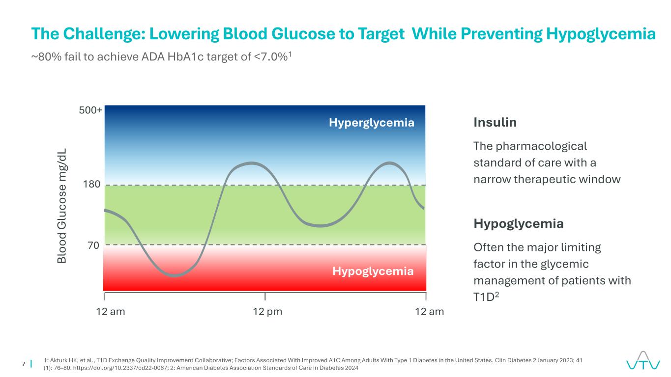 6 Cadisegliatin:有可能成为T1D新型口服肝脏选择性葡萄糖激酶激活剂的首个口服辅助疗法,与单独使用胰岛素相比,可降低低血糖并改善血糖控制1:Akturk HK等人,T1D交换质量改进合作;与美国1型糖尿病成人A1C改善相关的因素。Clin Diabetes 2023年1月2日;41(1):76 – 80。https://doi.org/10.2337/cd22-0067;2:American Diabetes Association Standards of Care in Diabetes – 2023;3:Internal Studies – data on file;4:Klein KR et al. The SimpliciT1 study:TTP399(一种肝选择性葡萄糖激酶激活剂)用于辅助治疗1型糖尿病的随机、双盲、安慰剂对照1b/2期适应性研究。糖尿病护理。2021年4月1日;44(4):960-8~80%的160万美国T1D患者未能实现目标血糖控制当前SOC1低血糖往往是血糖控制的主要障碍2给药至今500 +受试者3对低血糖和HBA1C4 3期试验的积极影响*启动2024年第二季度FDA突破性指定*在人类ADME研究中发现色谱信号后,致力于解决FDA对cadisegliatin计划的临床搁置,该研究针对的是后期开发中的Ph1和Ph2数据衍生的高未满足需求