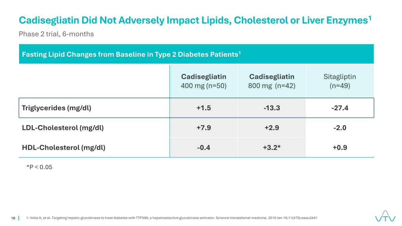 18 Cadisegliatin对脂质、胆固醇或肝酶没有不良影响1 2期试验,6个月1:Vella A等人。靶向肝葡萄糖激酶治疗糖尿病的TTP399,一种肝选择性葡萄糖激酶激活剂。科学转化医学。2019年1月16日;11(475):eaau3441 2型糖尿病患者从基线开始的空腹脂质变化1 Cadisegliatin 400 mg(n = 50)Cadisegliatin 800 mg(n = 42)Sitagliptin(n = 49)甘油三酯(mg/dl)+ 1.5-13.3-27.4 LDL-胆固醇(mg/dl)+ 7.9 + 2.9-2.0 HDL-胆固醇(mg/dl)-0.4 + 3.2*+0.9*P < 0.05