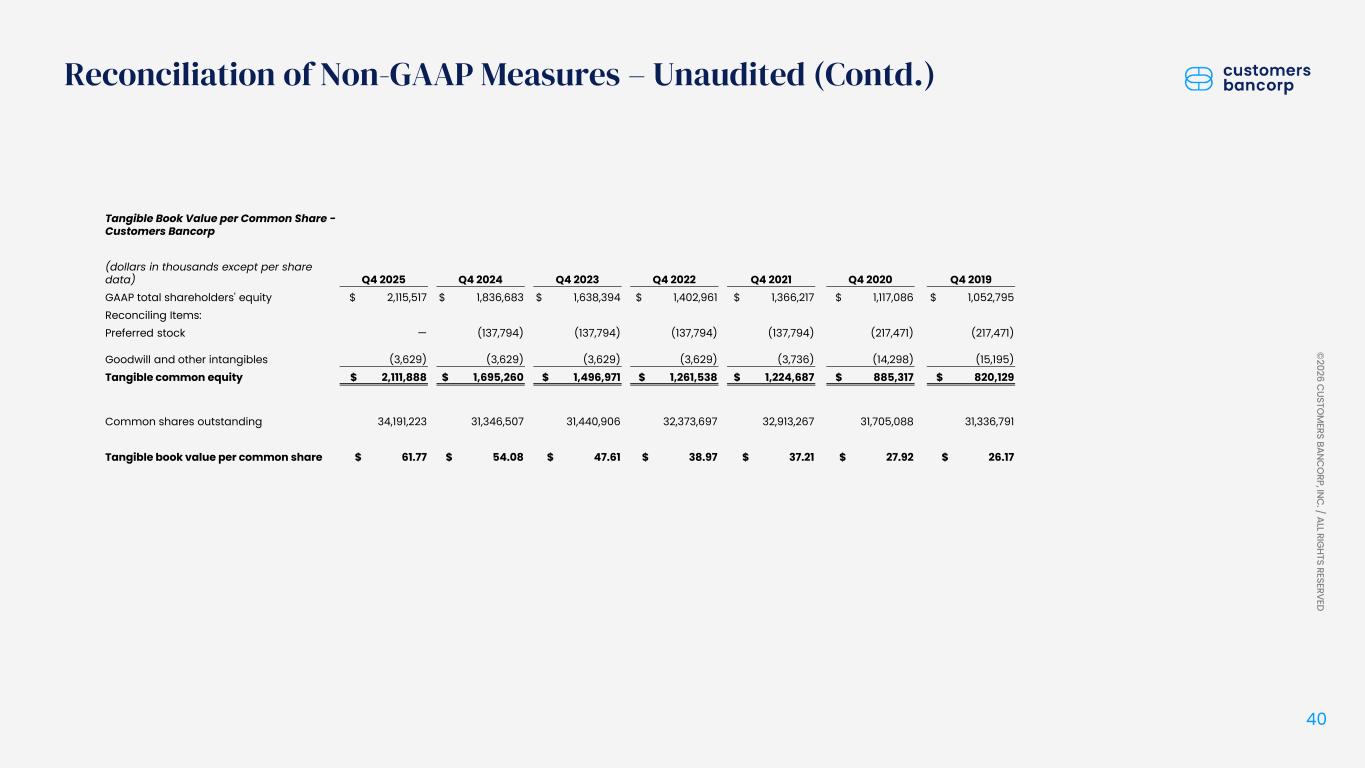 39©2026 C USTO M ERS BANC O RP,INC。/ALL RIG HTS RESERVED Non-GAAP Measures的对账-未经审计(续)每股普通股的有形账面价值-客户合众银行(以千美元计,每股数据除外)Q4 2025 Q3 2025 Q2 2025 Q1 2025 Q4 2024 GAAP股东权益总额$ 2,115,517 $ 2,126,059 $ 1,863,558 $ 1,864,560 $ 1,836,683调节项目:优先股—(82,201)(82,201)(137,794)(137,794)商誉和其他无形资产(3,629)(3,629)(3,629)(3,629)(3,629)有形普通股权益$ 2,111,888 $ 2,040,229 $ 1,777,728 $ 1,723,137 $ 1,695,260已发行普通股34,191,22334,163,50631,606,93431,479,13231,346,507每股普通股有形账面价值$ 61.77 $ 59.72 $ 56.24 $ 54.74 $ 54.08