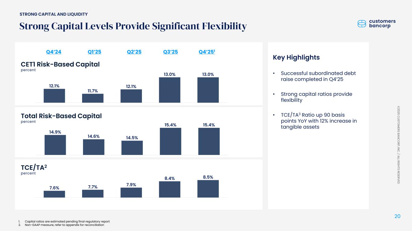 19©2026 C USTO M ERS BANC O RP,INC。/所有RIG HTS储备有形账面价值1每股有形账面价值接近62美元/股1。Non-GAAP衡量标准,对账2参考附录。包括AOCI盯市影响的Q4’19到Q4’25的CAGR;Q4’19和Q4’25 AOCI影响分别为每股(0.04)美元和(1.58)美元3。2025年代理同行最近一个季度(“MRQ”);对于在2026年1月22日之前报告了收益数据的代理同行银行,MRQ代表Q4’25。否则代表Q3’25数据$ 26.17 $ 27.92 $ 37.21 $ 38.97 $ 47.61 $ 54.08 $ 61.77 20192020202120212022202320242025 + 15%有形账面价值增长• TBVPS1环比增长3%,同比增长超14% •每股有形账面价值1自Q4’192年以来增长约2.4倍• TBVPS1自Q4’192年以来的复合年增长率为15+% 2,而区域银行同业为5% 3主要亮点