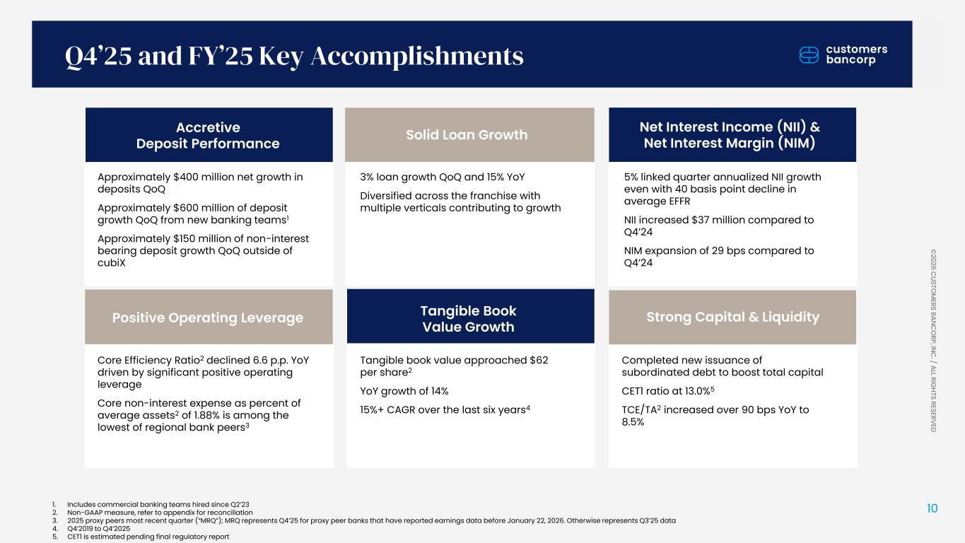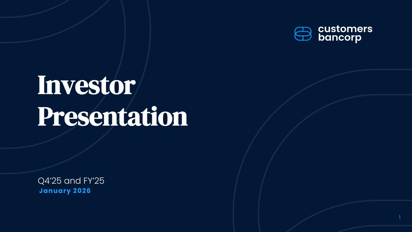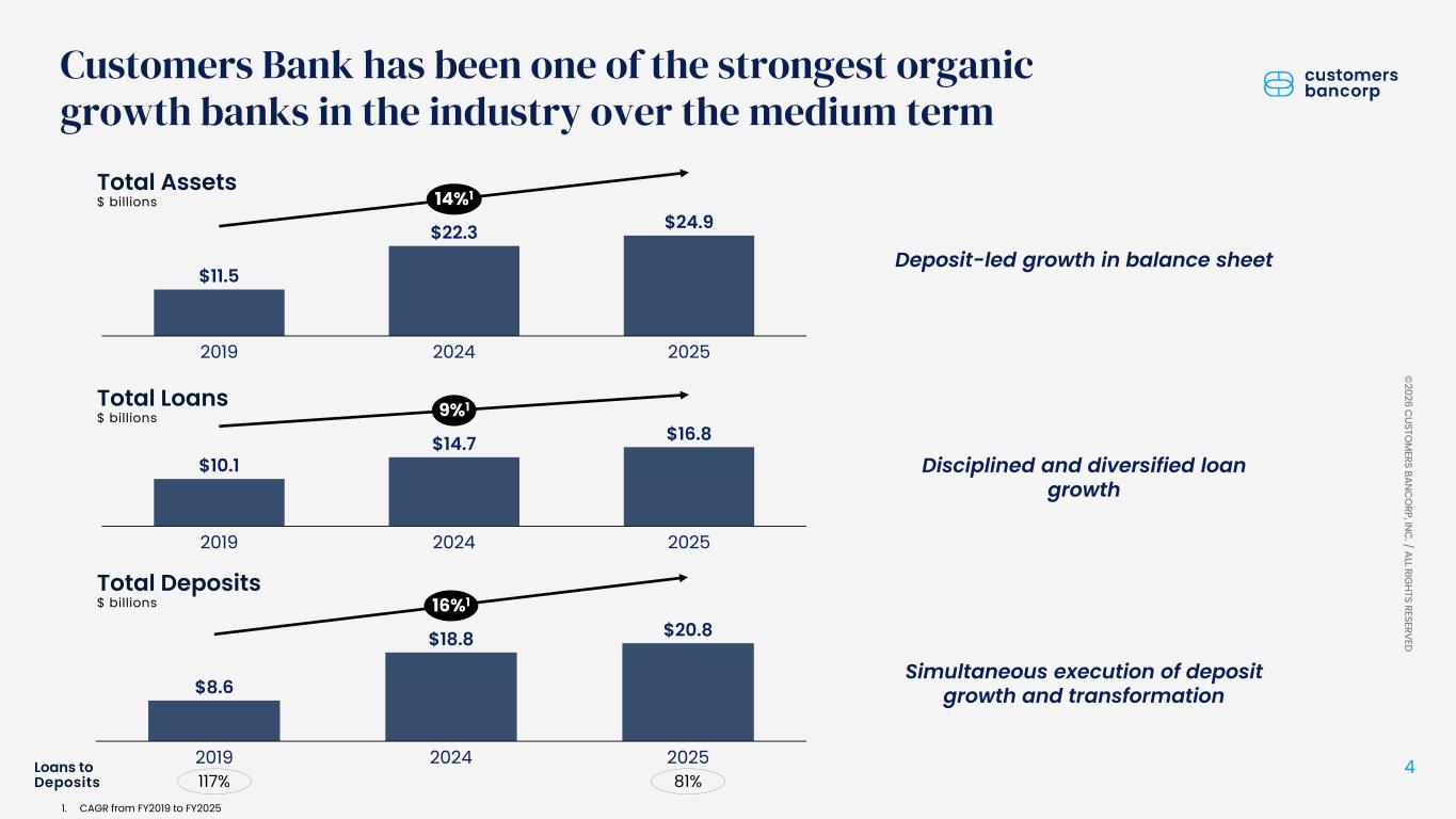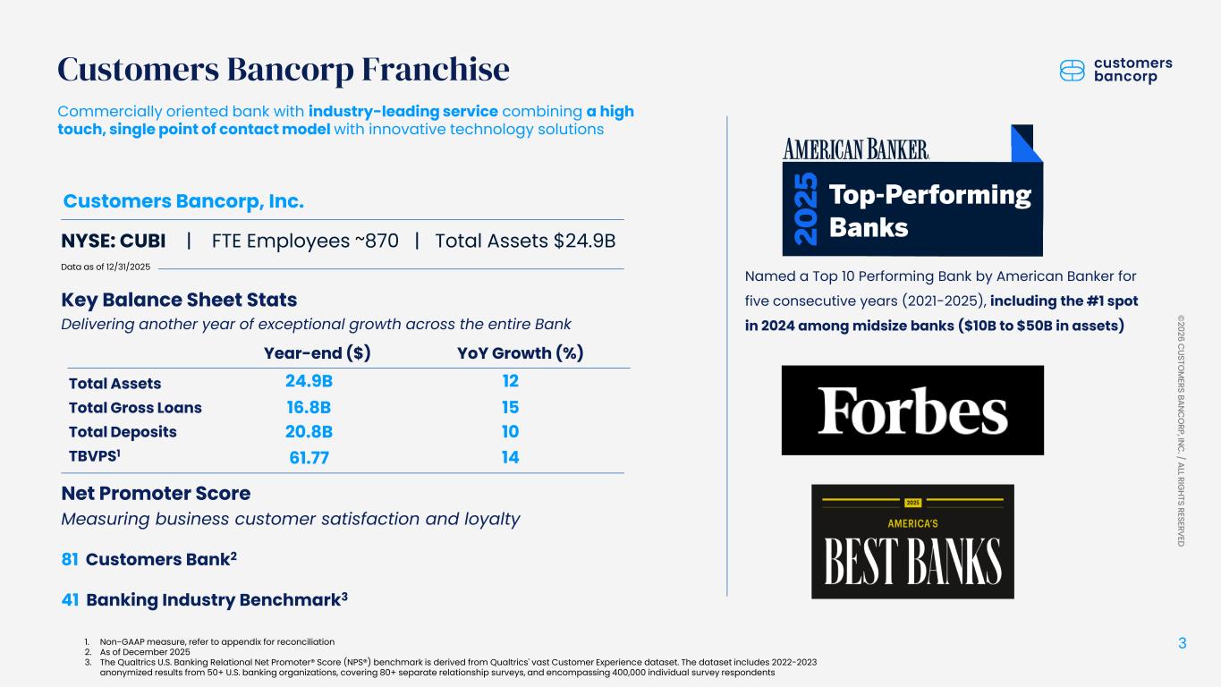 2©2026 C USTO M ERS BANC O RP,INC。/All RIG HTS reserved除历史信息外,本演示文稿可能包含1995年《私人证券诉讼改革法案》“安全港”条款含义内的“前瞻性陈述”。这些前瞻性陈述包括有关Customers Bancorp, Inc.的战略、目标、信念、期望、估计、意图、筹资努力、财务状况和经营成果、未来业绩和业务的陈述。前面、后面或包含“可能”、“可能”、“应该”、“形式上”、“期待”、“将”、“相信”、“预期”、“预期”、“估计”、“打算”、“计划”、“项目”或类似表述的陈述通常表示前瞻性陈述。这些前瞻性陈述涉及风险和不确定性,这些风险和不确定性可能会根据各种重要因素(其中一些因素全部或部分超出Customers Bancorp, Inc.的控制范围)发生变化。除其他外,众多竞争性、经济、监管、法律和技术事件和因素可能导致Customers Bancorp, Inc.的财务业绩与此类前瞻性陈述中表达的目标、计划、目的、意图和预期存在重大差异,包括:银行业近期动荡的延续、美国和监管机构为减轻和管理相关风险而采取的应对措施、为解决相关问题以及与之相关的成本和义务而采取的监管行动,例如FDIC特别评估;监管违规、调查和检查(包括潜在的监管行动)导致的负面后果的可能性,评估罚款和处罚、实施制裁、采取补救行动的必要性以及对我们声誉可能造成的损害;竞争对存款利率和增长、贷款利率和增长以及净息差的影响;未能识别并充分和及时应对网络安全风险,包括数据泄露和网络攻击;公共卫生危机和流行病及其对我们经营所在的经济和商业环境的影响;地缘政治条件,包括恐怖主义行为或威胁,美国或其他政府为应对恐怖主义行为或威胁以及军事冲突而采取的行动,包括俄罗斯和乌克兰之间的战争以及中东或南美持续的冲突,这可能会影响美国的经济状况;经济变化对我们的贷款和租赁组合的表现、我们的投资证券的市场价值、对我们的产品和服务的需求以及资金来源的可用性的影响;联邦政府,包括美联储系统理事会和其他政府机构的行动的影响,影响市场利率和货币供应;我们和客户为应对这些事态发展而采取的行动以及这些行动对我们的运营、产品、服务和客户关系产生的影响;更高的通货膨胀及其影响;美国贸易政策变化的影响,包括对其贸易伙伴征收关税和报复性关税;以及会计准则或政策的任何变化的影响。客户合众银行,Inc.告诫说,上述因素并非排他性的,此类因素或任何此类前瞻性陈述均未将任何未来事件的影响考虑在内。本文列出的所有前瞻性陈述和信息均基于管理层截至本文发布之日的当前信念和假设,并且仅在做出这些陈述之日发表。有关与我们业务相关的假设、风险和不确定性的更完整讨论,我们鼓励您审阅Customers Bancorp, Inc.向美国证券交易委员会提交的文件,包括其截至2024年12月31日止年度的最近的10-K表格年度报告,随后提交的10-Q表格季度报告和8-K表格当前报告,包括对其的任何修订,这些报告更新或提供了除10-K表格和10-Q表格文件(如果有)中包含的信息之外的信息。客户合众银行,Inc.不承诺更新任何可能由客户合众银行 Bancorp,Inc.或由或代表客户银行不时作出的书面或口头前瞻性陈述,除非适用法律可能要求。前瞻性陈述