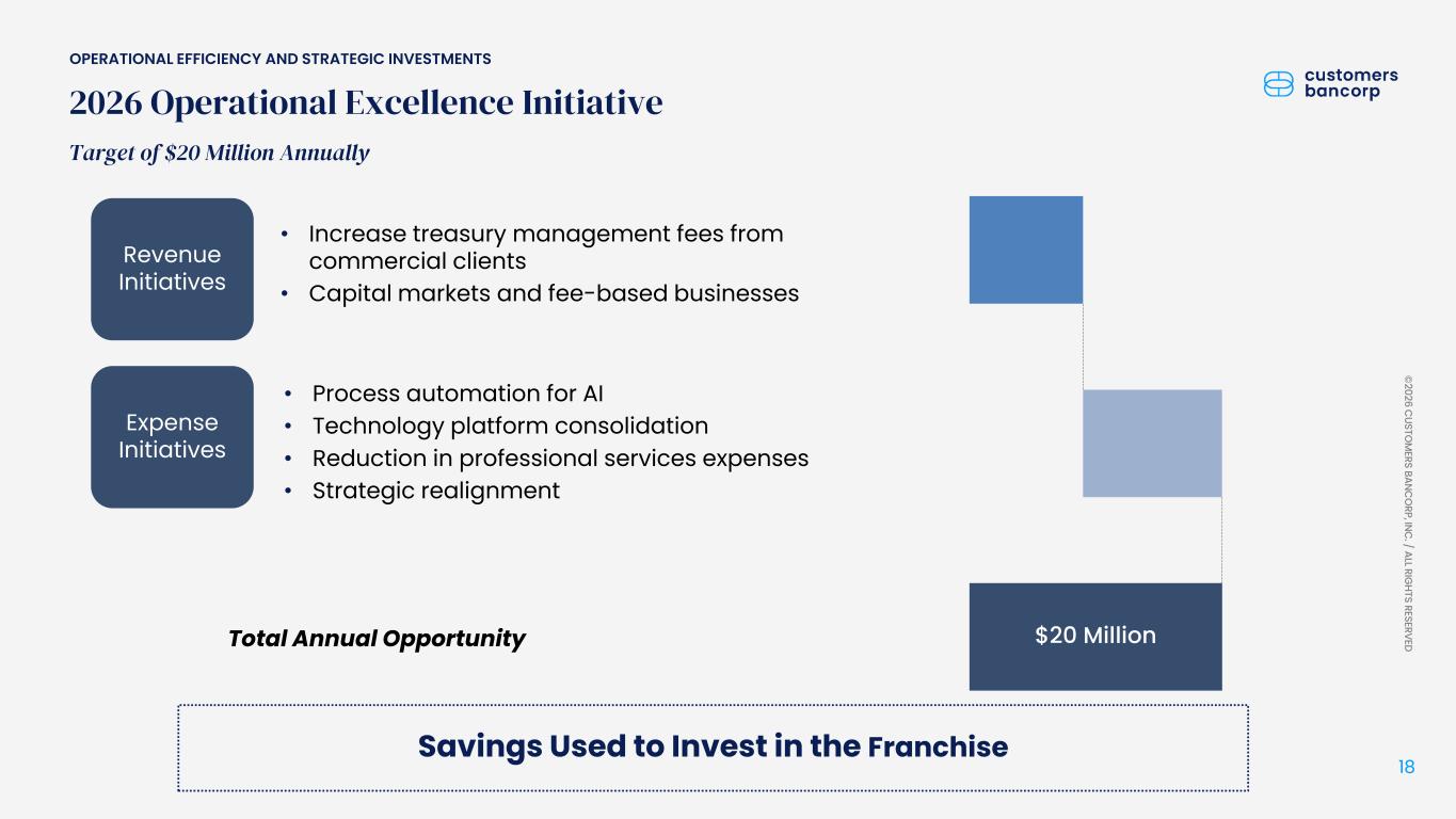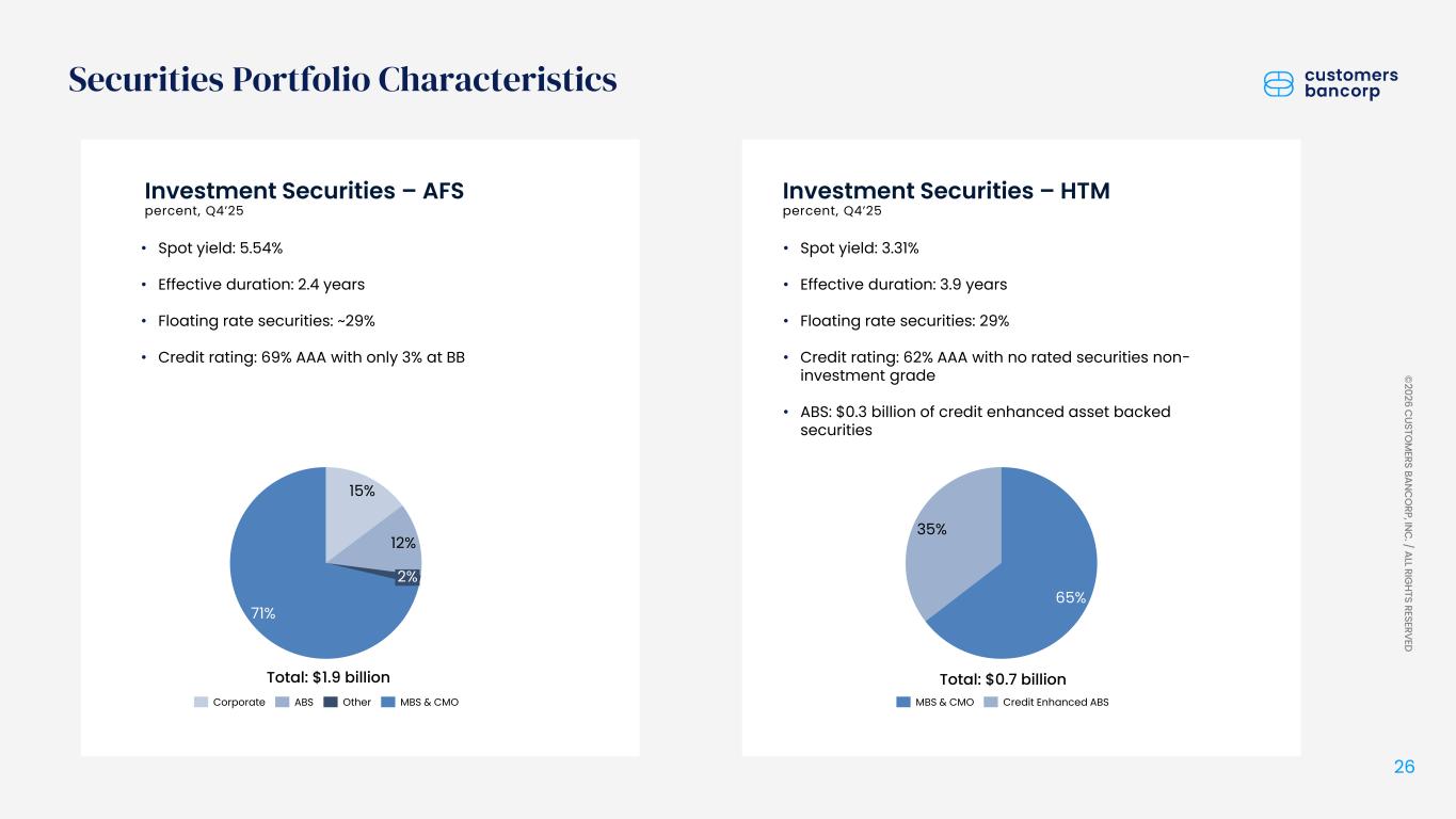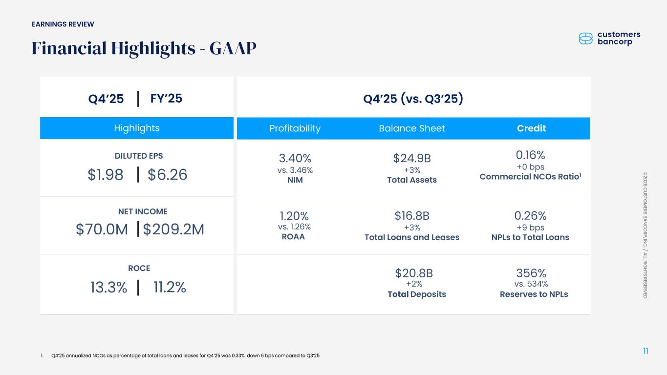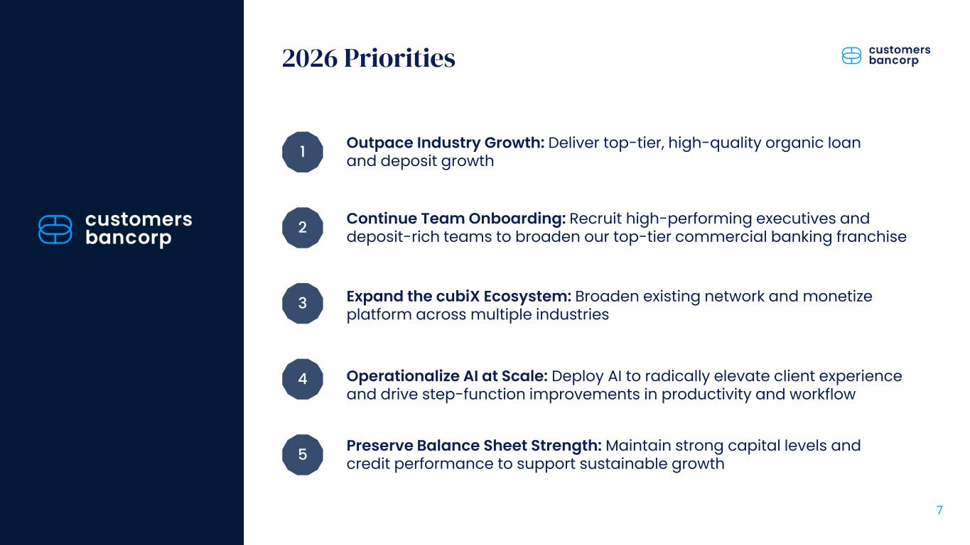 2©2026 C USTO M ERS BANC O RP,INC。/All RIG HTS reserved除历史信息外,本演示文稿可能包含1995年《私人证券诉讼改革法案》“安全港”条款含义内的“前瞻性陈述”。这些前瞻性陈述包括有关Customers Bancorp, Inc.的战略、目标、信念、期望、估计、意图、筹资努力、财务状况和经营成果、未来业绩和业务的陈述。前面、后面或包含“可能”、“可能”、“应该”、“形式上”、“期待”、“将”、“相信”、“预期”、“预期”、“估计”、“打算”、“计划”、“项目”或类似表述的陈述通常表示前瞻性陈述。这些前瞻性陈述涉及风险和不确定性,这些风险和不确定性可能会根据各种重要因素(其中一些因素全部或部分超出Customers Bancorp, Inc.的控制范围)发生变化。除其他外,众多竞争性、经济、监管、法律和技术事件和因素可能导致Customers Bancorp, Inc.的财务业绩与此类前瞻性陈述中表达的目标、计划、目的、意图和预期存在重大差异,包括:银行业近期动荡的延续、美国和监管机构为减轻和管理相关风险而采取的应对措施、为解决相关问题以及与之相关的成本和义务而采取的监管行动,例如FDIC特别评估;监管违规、调查和检查(包括潜在的监管行动)导致的负面后果的可能性,评估罚款和处罚、实施制裁、采取补救行动的必要性以及对我们声誉可能造成的损害;竞争对存款利率和增长、贷款利率和增长以及净息差的影响;未能识别并充分和及时应对网络安全风险,包括数据泄露和网络攻击;公共卫生危机和流行病及其对我们经营所在的经济和商业环境的影响;地缘政治条件,包括恐怖主义行为或威胁,美国或其他政府为应对恐怖主义行为或威胁以及军事冲突而采取的行动,包括俄罗斯和乌克兰之间的战争以及中东或南美持续的冲突,这可能会影响美国的经济状况;经济变化对我们的贷款和租赁组合的表现、我们的投资证券的市场价值、对我们的产品和服务的需求以及资金来源的可用性的影响;联邦政府,包括美联储系统理事会和其他政府机构的行动的影响,影响市场利率和货币供应;我们和客户为应对这些事态发展而采取的行动以及这些行动对我们的运营、产品、服务和客户关系产生的影响;更高的通货膨胀及其影响;美国贸易政策变化的影响,包括对其贸易伙伴征收关税和报复性关税;以及会计准则或政策的任何变化的影响。客户合众银行,Inc.告诫说,上述因素并非排他性的,此类因素或任何此类前瞻性陈述均未将任何未来事件的影响考虑在内。本文列出的所有前瞻性陈述和信息均基于管理层截至本文发布之日的当前信念和假设,并且仅在做出这些陈述之日发表。有关与我们业务相关的假设、风险和不确定性的更完整讨论,我们鼓励您审阅Customers Bancorp, Inc.向美国证券交易委员会提交的文件,包括其截至2024年12月31日止年度的最近的10-K表格年度报告,随后提交的10-Q表格季度报告和8-K表格当前报告,包括对其的任何修订,这些报告更新或提供了除10-K表格和10-Q表格文件(如果有)中包含的信息之外的信息。客户合众银行,Inc.不承诺更新任何可能由客户合众银行 Bancorp,Inc.或由或代表客户银行不时作出的书面或口头前瞻性陈述,除非适用法律可能要求。前瞻性陈述