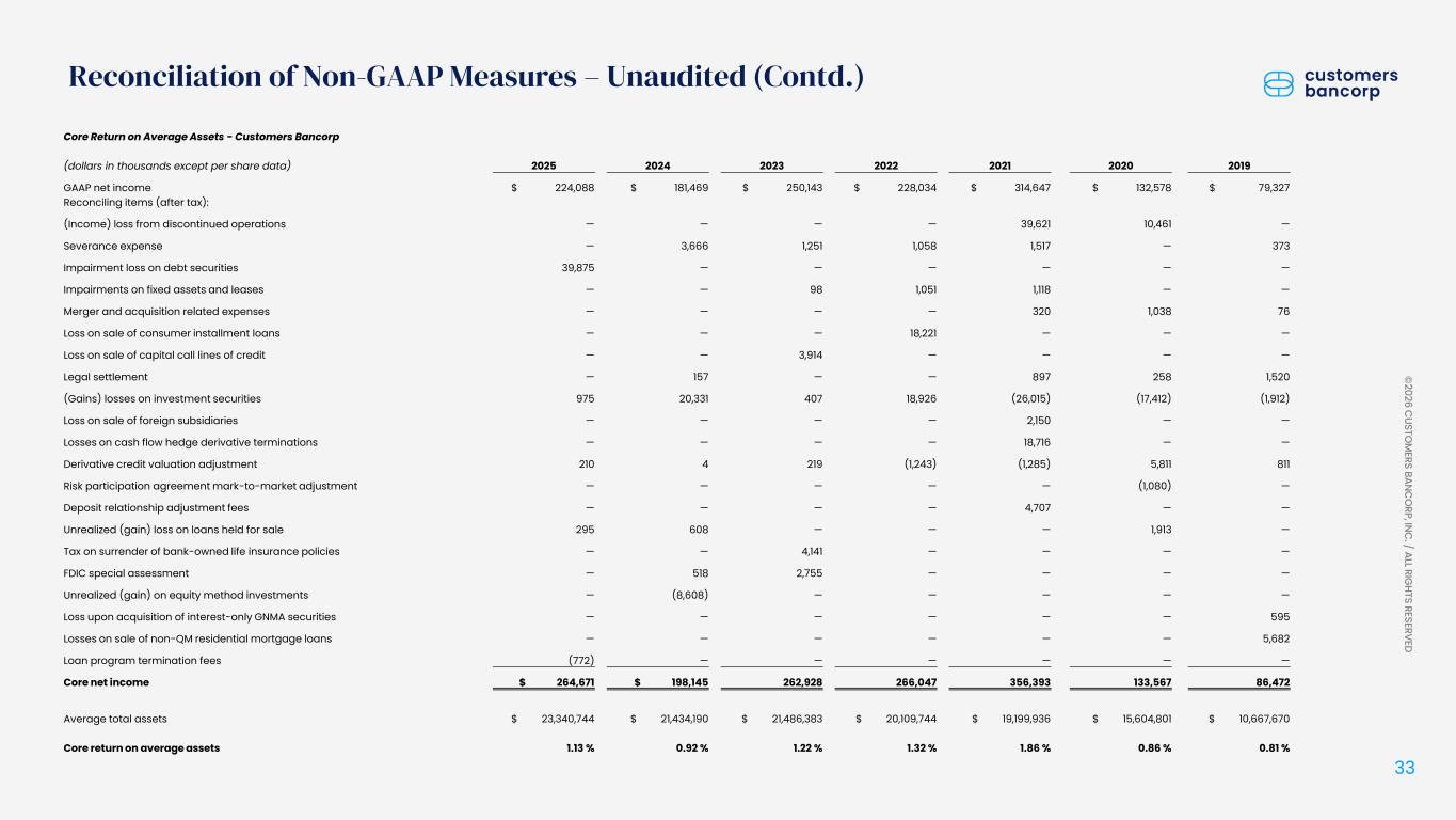 32©2026 C USTO M ERS BANC O RP,INC。/All RIG HTS RESERVED Non-GAAP Measures的对账-未经审计(续)核心平均资产回报率-客户合众银行截至12月31日的12个月,(千美元每股数据除外)Q4 2025 Q3 2025 Q2 2025 Q1 2025 Q4 202420252024 GAAP净收入74,492美元75,745美元60,939美元12,912美元26,915美元224,088美元181,469美元调节项目(税后):遣散费———— 1,198 — 3,666债务证券减值损失———— 39,875 — 39,875 —法律和解———— 157 — 157(收益)投资证券损失(36)(253)1,388(124)20,03597520,331衍生信用估值调整———— 210(306)2104 FDIC特别评估—————— 518权益法投资未实现(收益)————(292)——(8,608)持有待售贷款未实现(收益)损失——(223)518110295608贷款计划终止费——(772)——(772)——核心净收入74,456美元75,492美元61,332美元53,391美元47,817美元264,671美元198,145平均总资产24,721,373美元23,930,723美元22,362,989美元22,314,963美元22,179,970美元23,340,744美元21,434,190核心平均资产收益率1.19% 1.25% 1.10% 0.97% 0.86% 1.13% 0.92%