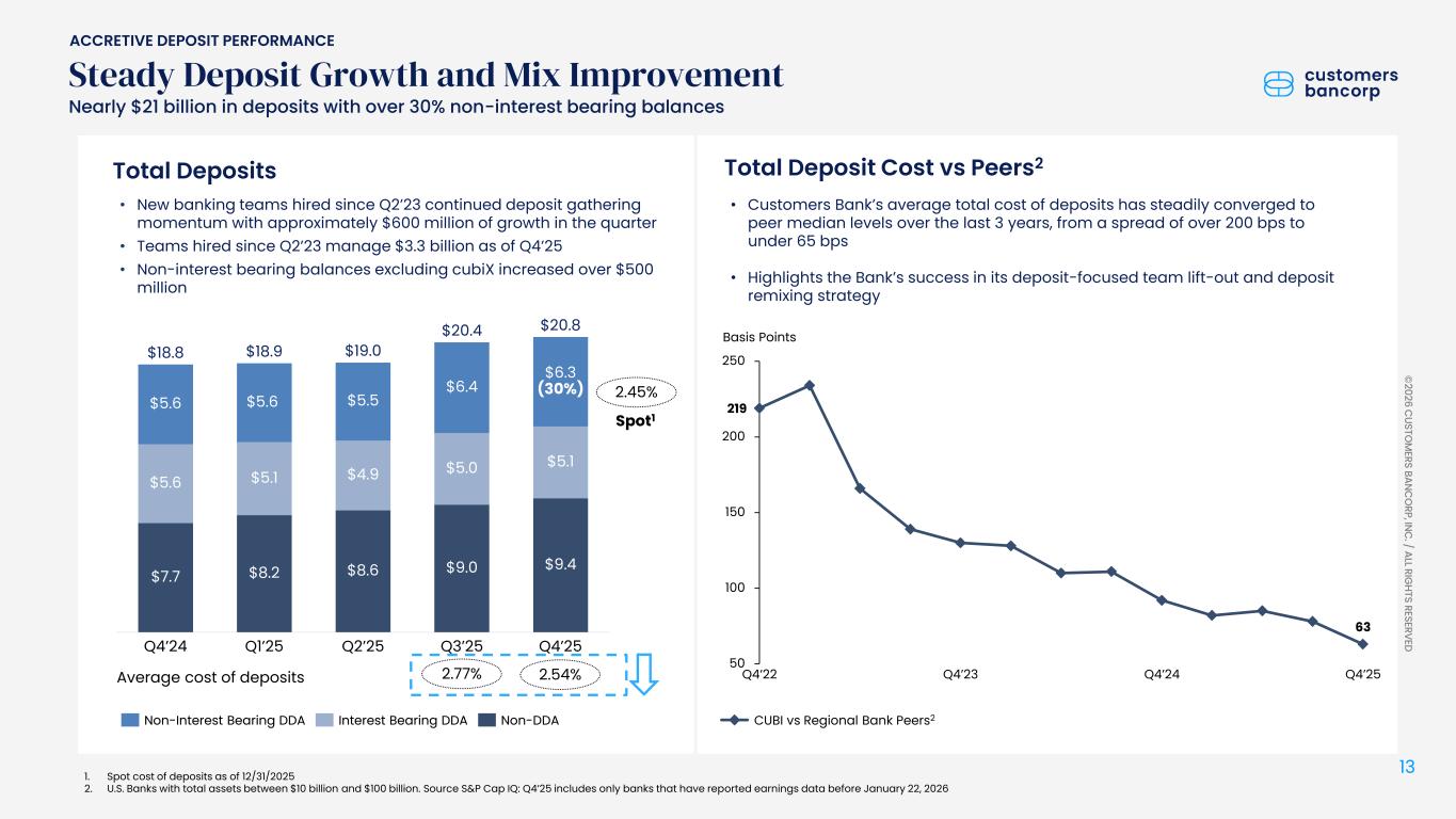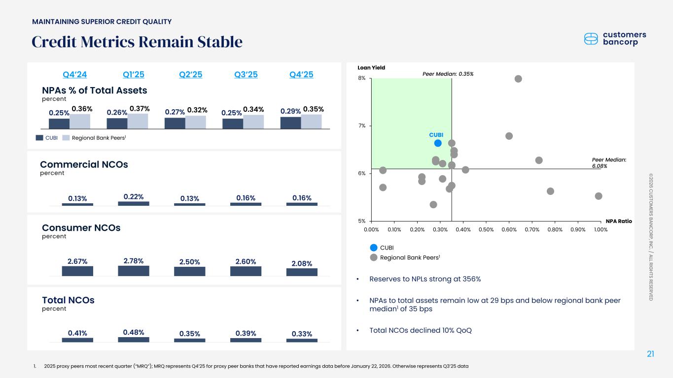 13©2026 C USTO M ERS BANC O RP,INC。/All RIG HTS reserved total deposit cost vs Peers2 1。截至2025年12月31日的存款即期成本2。总资产在100亿美元到1000亿美元之间的美国银行。来源标普 Cap IQ:Q4’25仅包括1月22日之前已公布收益数据的银行,2026年无息DDA有息DDA非DDA总存款平均存款成本2.77% $ 5.6 $ 5.6 $ 7.7 Q4’24 $ 5.6 $ 5.1 $ 8.2 Q1’25 $ 5.5 $ 4.9 $ 8.6 Q2’25 $ 6.4 $ 5.0 $ 9.0 Q3’25 $ 6.3(30%)$ 5.1 $ 9.4 Q4’25 $ 18.8 $ 18.9 $ 19.0 $ 20.4 $ 20.8 •自Q2’23以来雇用的新银行团队继续保持存款聚集势头,本季度增长约6亿美元•自Q2’23以来雇用的团队截至Q4’25管理着33亿美元•不包括cubiX的无息余额增加超过5亿美元2.54%稳定的存款增长和组合改善近210亿美元存款中超过30%的无息余额应计存款业绩2.45%现货12196350100150200250基点Q4‘22 Q4’23 Q4‘24 Q4’25 CUBI vs区域银行同业2 •客户银行的平均存款总成本在过去3年中稳步收敛到同业中位水平,从超过200个基点的利差下降到65个基点以下•凸显了该银行在以存款为重点的团队提升和存款重新混合战略方面取得的成功
