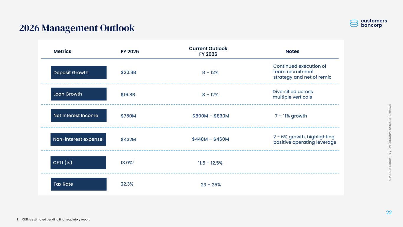 21©2026C USTO M ERS BANC O RP,INC。/所有RIG HTS储备商业NCO百分比NPAs %占总资产百分比信用指标保持稳定消费者NCO百分比总NCO百分比保持卓越信用质量1。2025年代理同行最近一个季度(“MRQ”);对于在2026年1月22日之前报告了收益数据的代理同行银行,MRQ代表Q4’25。否则代表Q3’25数据V •不良贷款准备金强劲至356% •不良贷款占总资产的比例仍较低,为29个基点及以下区域银行同业中位数1为35个基点• NCO总数环比下降10% Q4’24 Q1’25 Q2’25 Q3’25 Q4’250.13% 0.22% 0.13% 0.16% 0.16% 2.67% 2.78% 2.50% 2.60% 2.08% 0.48% 0.35% 0.39% 0.33% 0.25% 0.26% 0.27% 0.25% 0.29% 0.36% 0.37% 0.32% 0.34% 0.35% CUBI区域银行同业15%6% 7% 8% 00% 0.10% 0.20% 0.30% 0.40% 0.50% 0.60% 0.70% 0.80% 0.90% 1.00% NPA比率贷款收益率CUBI同业中位数:0.35%同业中位数:6.08% CUBI区域银行同业1