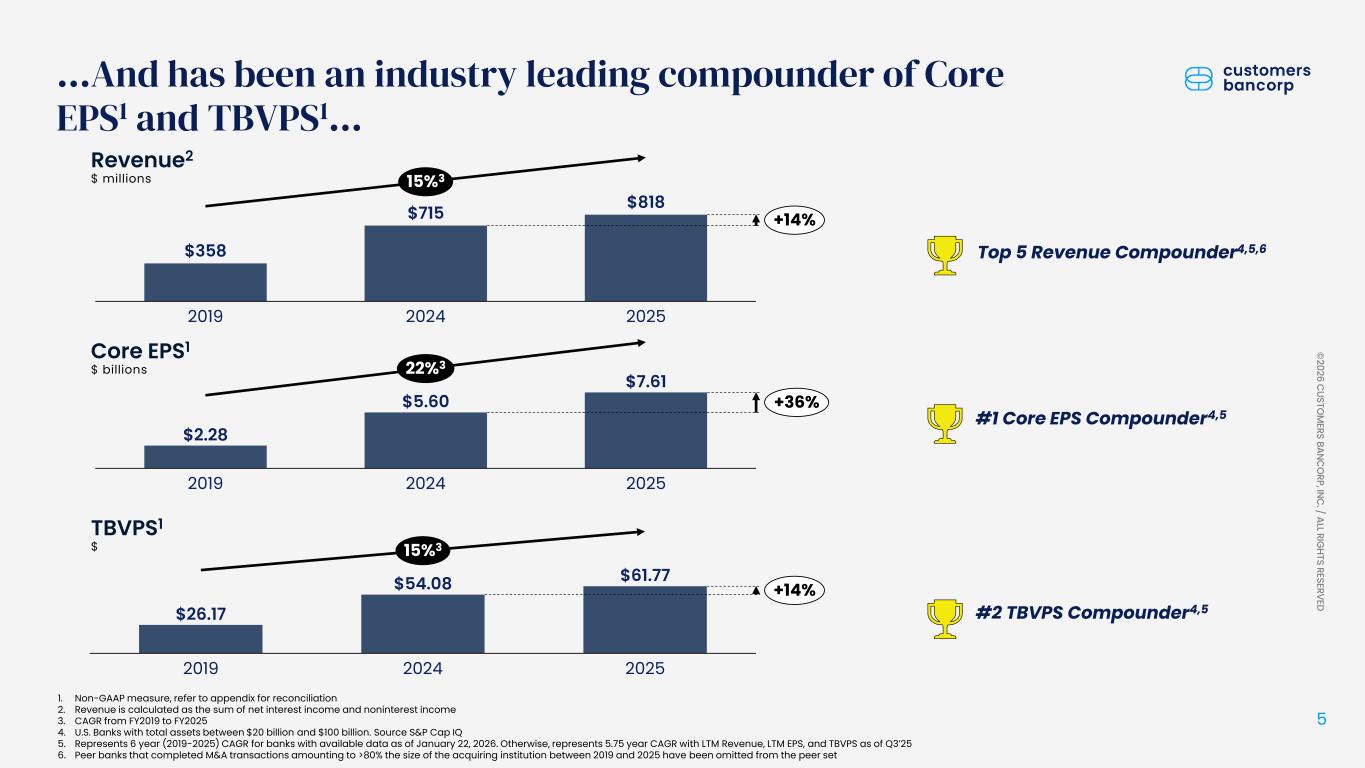 4©2026 C USTO M ERS BANC O RP,INC。/All RIG HTS Reserved Customers Bank has been one of the strongest organic growth banks in the industry over the medium-term total loans $ billions total deposits $ billions deposit-led growth in balance sheet Disciplined and diversified loan growth simultaneous execution of deposit growth and transformation total assets $ billions loans to deposits 201920242025 $ 10.1 $ 14.7 $ 16.89% 1201920242025 $ 11.5 $ 22.3 $ 24.914% 1201920242025 $ 8.6 $ 18.8 $ 20.816% 11117% 81%2019财年到2025财年的复合年增长率