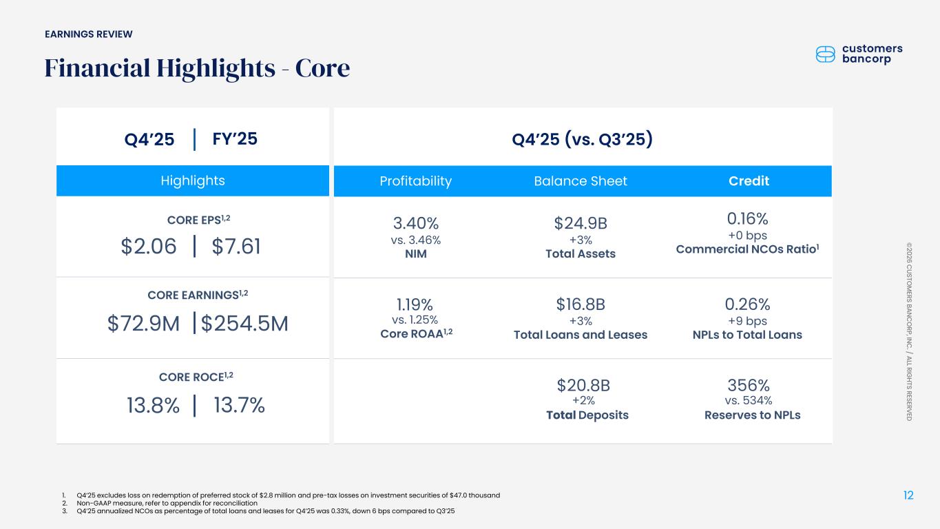 11©2026 C USTO M ERS BANC O RP,INC。/ALL RIG HTS RESERVed Q4’25(vs. Q3’25)盈利能力资产负债表信贷3.40% vs. 3.46% NIM $ 24.9b + 3%总资产0.16% + 0bps商业NCO比率1 $ 16.8b + 3%贷款和租赁总额0.26% + 9bps NPLs to Total Loans Financial Highlights-GAAP Highlights Q4’25 Earnings Review Total Deposits $ 20.8b + 2% Reserves to NPLs 356% vs. 534% $ 6.26 $ 2.092M 11.2% $ 1.98稀释EPS $ 7000万净收入ROCE 13.3% ROAA 1.20% vs. FY'25 1.26%。Q4’25年化NCO占Q4’25贷款和租赁总额的百分比为0.33%,较Q3’25 Q4’25下降6个基点(vs. Q3’25)