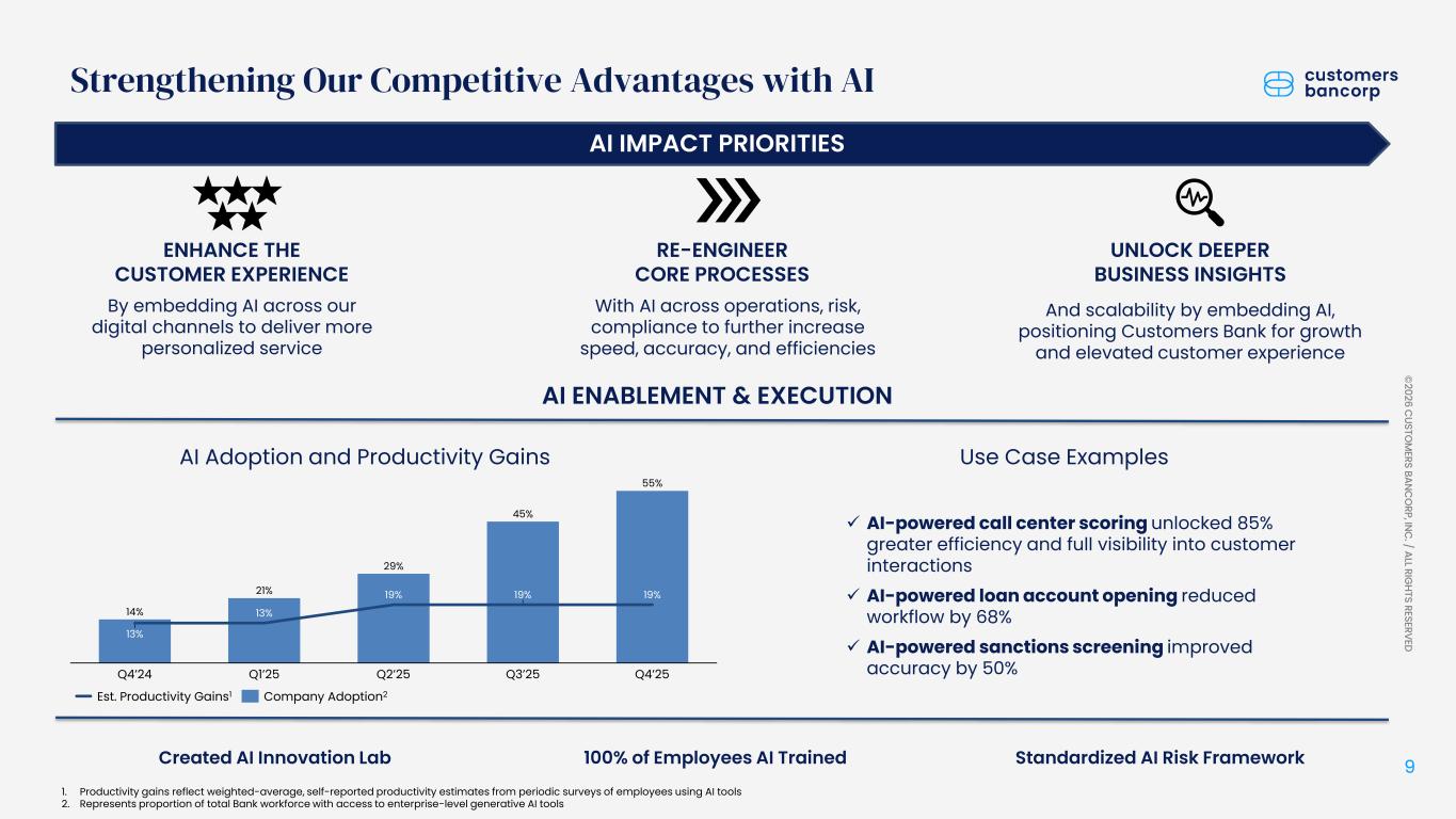9©2026 C USTO M ERS BANC O RP,INC。/All RIG HTS RESERVed通过AI加强我们的竞争优势丨AI驱动的呼叫中心评分解锁了85%的更高效率和对客户互动的全面可见度丨AI驱动的贷款开户将工作流程减少了68%丨AI驱动的制裁筛选通过嵌入AI将准确度和可扩展性提高了50%,将客户银行定位于增长,并通过AI在运营、风险、合规方面提升客户体验,以进一步提高速度、准确性,通过在我们的数字渠道中嵌入AI以提供更个性化的服务来提高效率,创建了AI创新实验室AI影响优先事项100%的员工AI培训标准化AI风险框架AI enablement & execution enhance enhances the customer experience re-engineer core processes unlock deeper business insights AI adoption and productivity gains 14% 21% 29% 45% 55% 13% 13% 19% 19% 19% Q4‘24 Q1’25 Q2‘25 Q3’25 Q4 ' 25 EST。生产力增益1公司采用21。生产率增长反映了使用人工智能工具对员工进行的定期调查得出的加权平均、自我报告的生产率估计2。代表有权访问企业级生成式AI工具用例示例的银行员工总数的比例