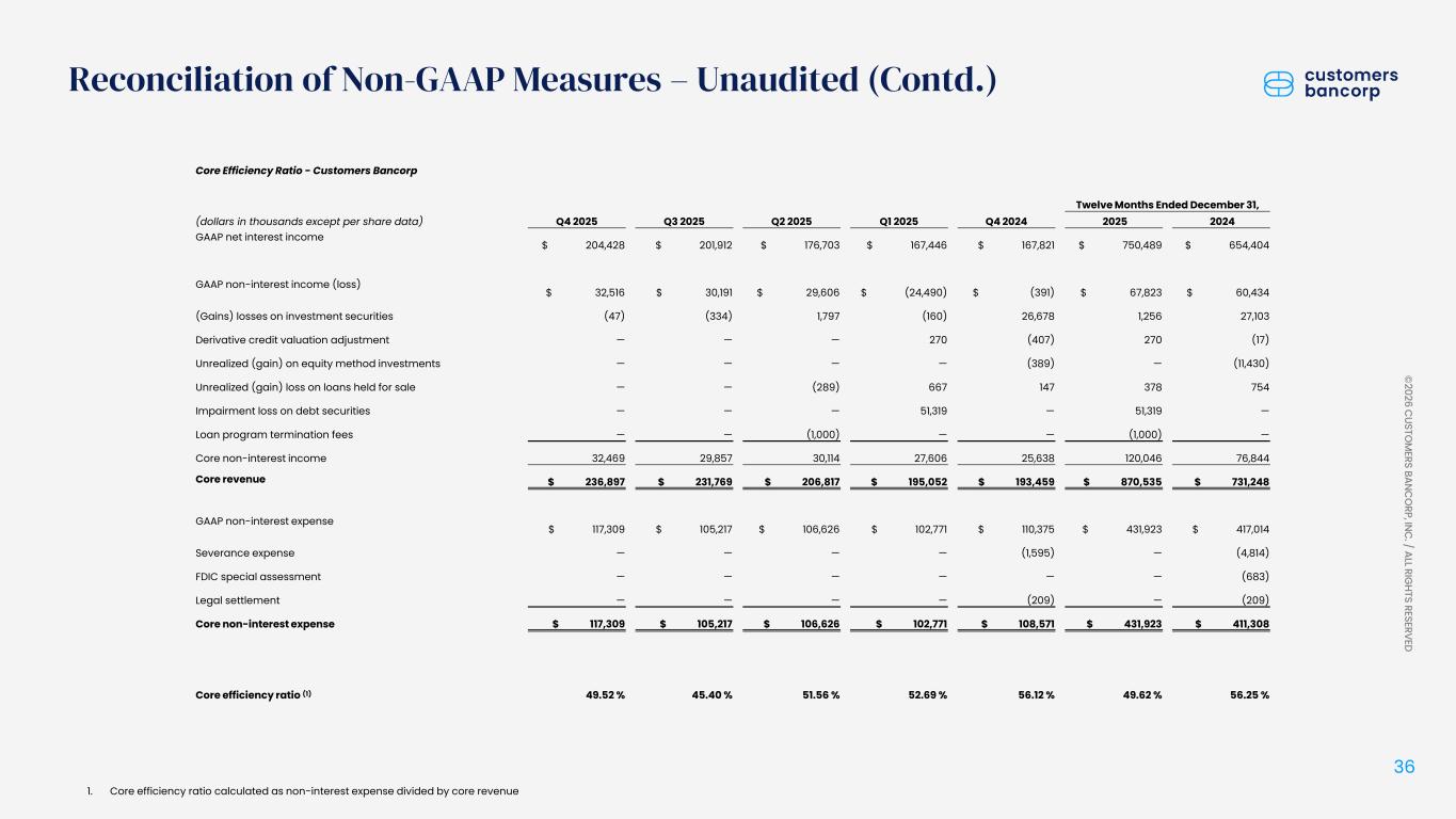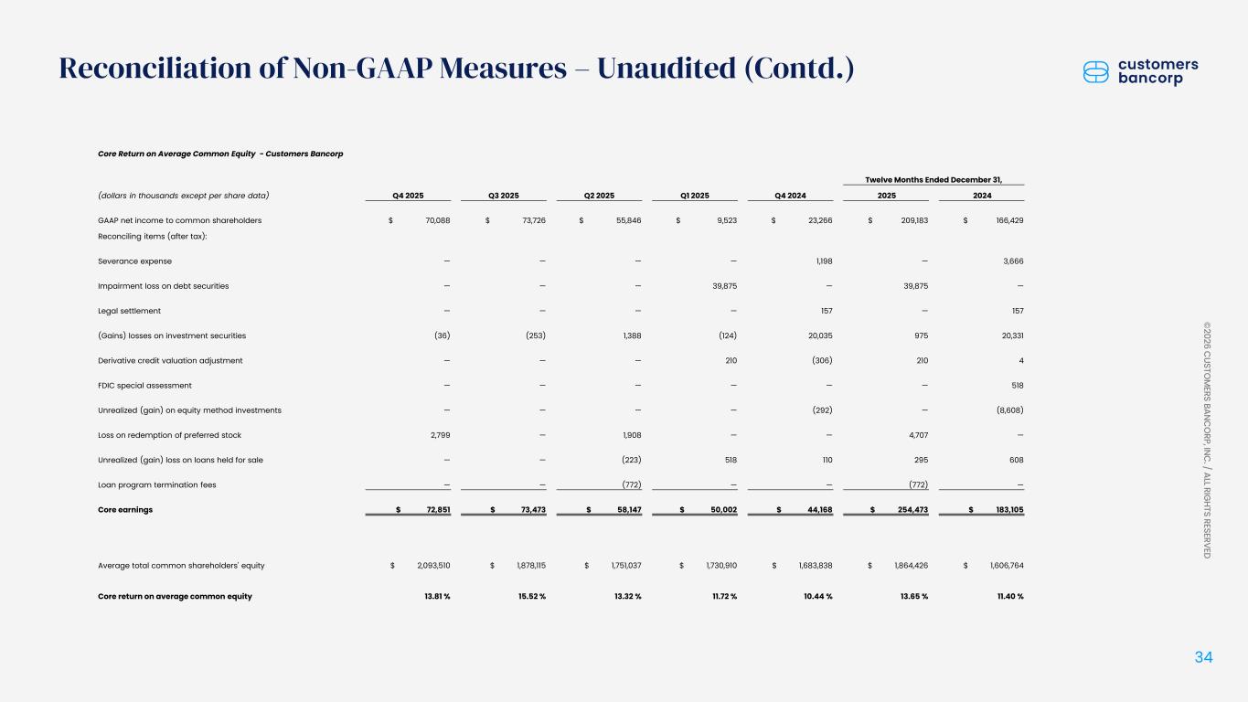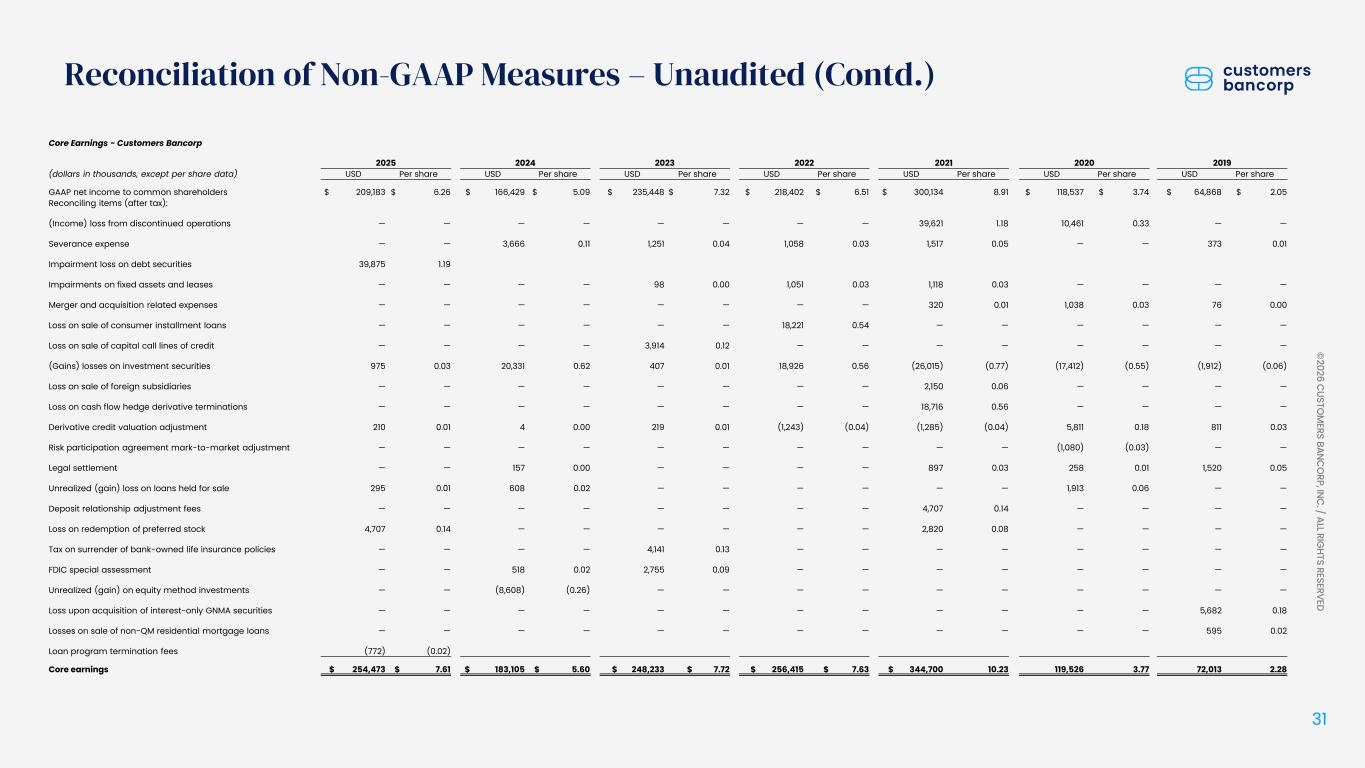 29©2026 C USTO M ERS BANC O RP,INC。/All RIG HTS RESERVED客户认为,本文件中披露的非公认会计原则计量有助于投资者、监管机构、管理层和其他人评估我们相对于其他金融机构的核心运营结果和财务状况。这些非GAAP财务指标被证券分析师、投资者和其他感兴趣的各方在评估客户所在行业的公司时经常使用。这些非GAAP财务指标从相应的GAAP指标中排除了我们认为不能代表我们持续财务业绩的某些要素的影响,我们认为这增强了对我们业绩的整体理解,并增加了我们期间业绩的可比性。投资者在评估我们的业绩或财务状况时,应考虑我们根据公认会计原则报告的业绩和财务状况以及所有其他相关信息。提出的非公认会计原则衡量标准不一定与其他金融机构可能提出的非公认会计原则衡量标准具有可比性。尽管非GAAP财务指标在评估公司时经常使用,但它们作为分析工具具有局限性,不应孤立地考虑或替代我们根据GAAP报告的运营结果或财务状况的分析。从2025年第三季度开始,不再包括对GAAP措施的某些调整,因为我们未来的意图是将这些调整限制在那些最重要的项目上。下表显示了本文件中披露的GAAP与非GAAP措施的对账情况。非GAAP措施的调节-未经审计