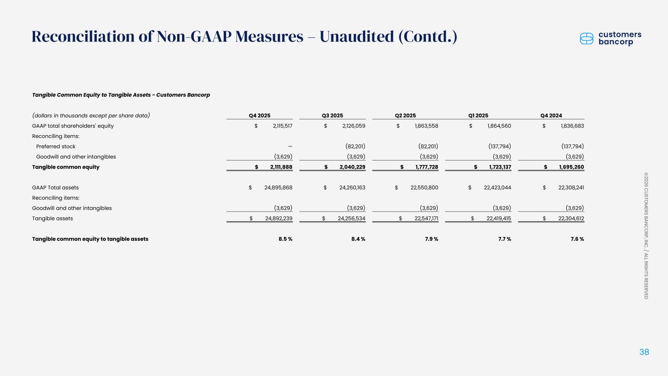 38©2026 C USTO M ERS BANC O RP,INC。/ALL RIG HTS RESERVED Non-GAAP Measures的对账-未经审计(续)有形普通股权益与有形资产的对账-客户合众银行(以千美元计,每股数据除外)Q4 2025 Q3 2025 Q2 2025 Q1 2025 Q4 2024 GAAP股东权益总额$ 2,115,517 $ 2,126,059 $ 1,863,558 $ 1,864,560 $ 1,836,683调节项目:优先股—(82,201)(82,201)(137,794)(137,794)商誉和其他无形资产(3,629)(3,629)(3,629)(3,629)(3,629)有形普通股权益$ 2,111,888 $ 2,040,229 $ 1,777,728 $ 1,723,137 $ 1,695,260 GAAP总资产$ 24,895,868 $ 24,260,163 $ 22,550,800 $ 22,423,044 $ 22,308,241调节项目:商誉和其他无形资产(3,629)(3,629)(3,629)(3,629)(3,629)(3,629)有形资产$ 24,892,239 $ 24,256,534 $ 22,547,171 $ 22,419,415 $ 22,304,612有形普通股权益比有形资产8.5%