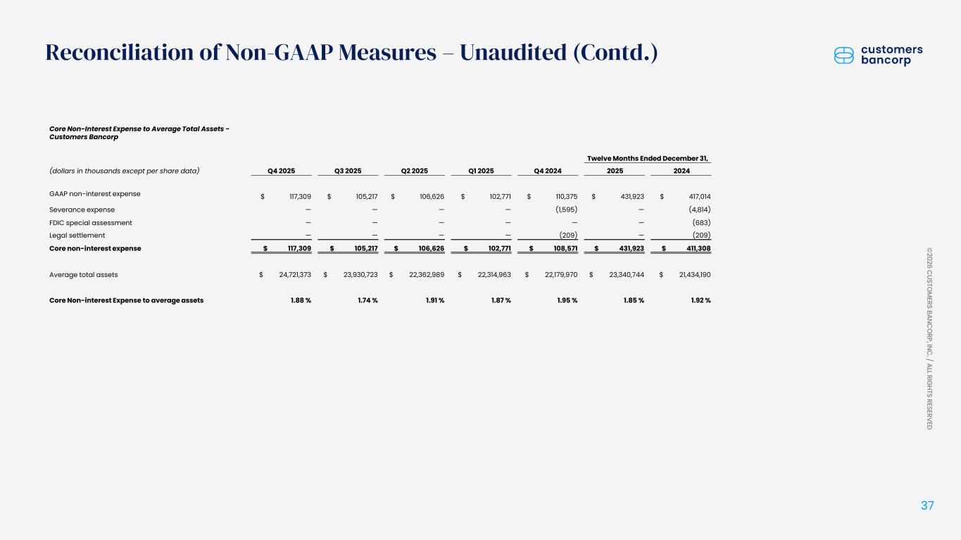 37©2026 C USTO M ERS BANC O RP,INC。/ALL RIG HTS RESERVed Non-GAAP措施的调节–未经审计(续)核心非利息费用与平均总资产的比率-客户合众银行截至12月31日的12个月,(千美元每股数据除外)Q4 2025Q3 2025Q2 2025Q1 2025Q4 202420252024 GAAP非利息费用$ 117,309 $ 105,217 $ 106,626 $ 102,771 $ 110,375 $ 431,923 $ 417,014离职费用————(1,595)——(4,814)FDIC特别评估——————(683)法律和解————(209)——(209)核心非利息费用117,309美元105,217美元106,626美元102,771美元108,571美元431,923美元411,308平均总资产24,721,373美元23,930,723美元22,362,989美元22,314,963美元22,179,970美元23,340,744美元21,434,190美元核心非利息资产1.88% 1.74% 1.91% 1.87% 1.95% 1.85% 1.92%