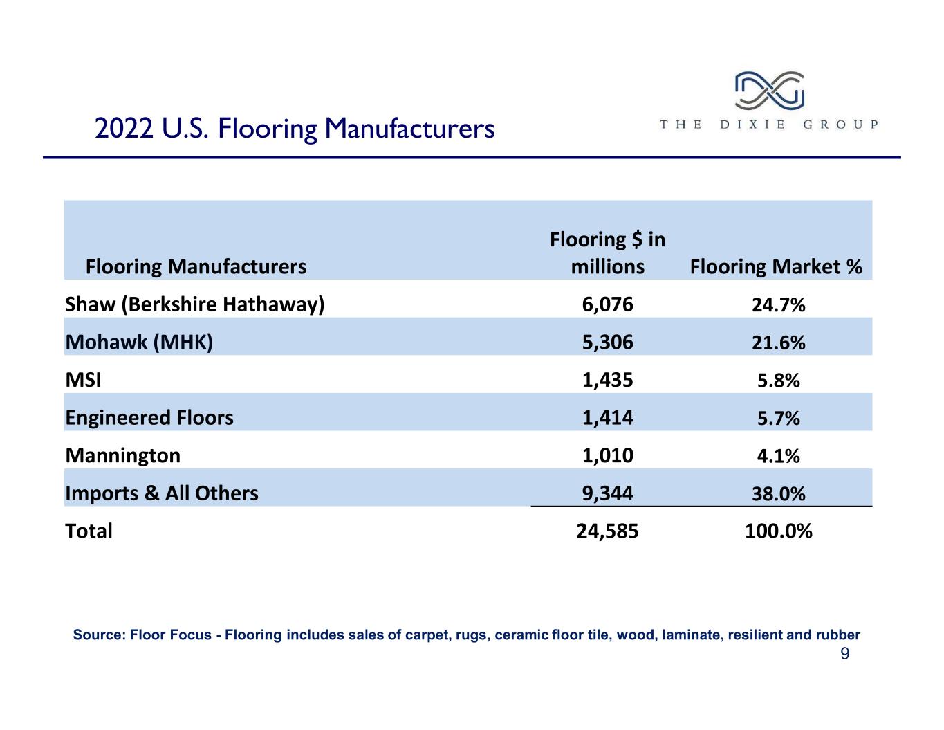2022美国地板制造商资料来源:地板焦点-地板包括地毯、地毯、陶瓷地砖、木材、层压板、弹性和橡胶的销售9地板市场%地板以百万美元计地板制造商24.7% 6,076Shaw(伯克希尔哈撒韦)21.6% 5,306Mohawk(MHK)5.8% 1,435MSI 5.7% 1,414Engineered Floors 4.1% 1,010Mannington 38.0% 9,344Imports & All Others 100.0% 24,585Total