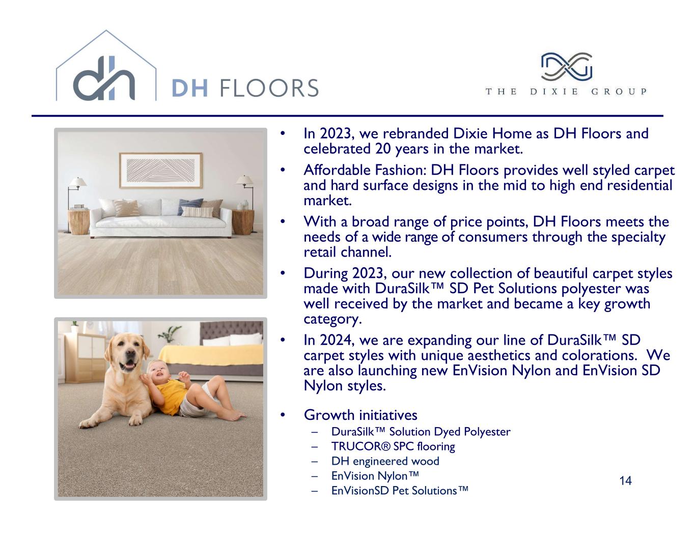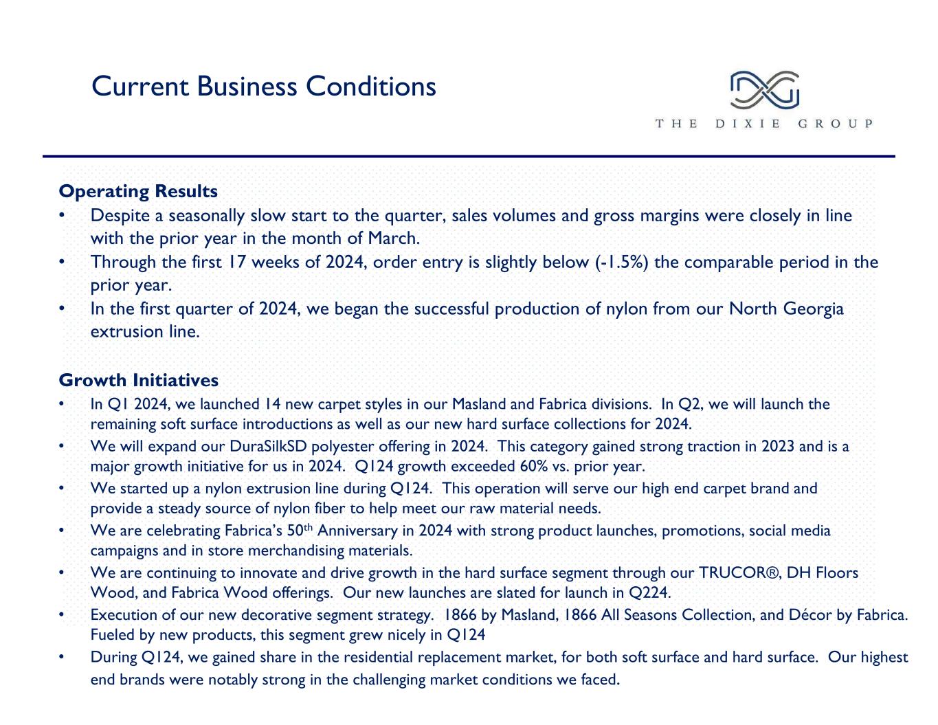 当前业务状况经营业绩•尽管本季度开局季节性缓慢,但3月份的销量和毛利率与去年同期保持密切一致。•在2024年的前17周,订单输入略低于(-1.5 %)上一年的可比期间。• 2024年第一季度,我们开始从我们的北乔治亚挤压线成功生产尼龙。增长计划• 2024年第一季度,我们在Masland和Fabrica部门推出了14种新的地毯款式。在第二季度,我们将推出剩余的软表面介绍以及我们2024年的新硬表面系列。•我们将在2024年扩大DuraSilkSD聚酯产品供应。这一类别在2023年获得了强大的牵引力,是我们在2024年的一项重大增长举措。Q124同比增长超过60%。•我们在Q124期间启动了一条尼龙挤压线。该操作将服务于我们的高端地毯品牌,并提供稳定的尼龙纤维来源,以帮助满足我们的原材料需求。•我们正在通过强大的产品发布、促销、社交媒体活动和店内商品宣传材料来庆祝Fabrica在2024年成立50周年。•我们通过TRUCOR ®、DH Floors Wood和Fabrica Wood产品,继续创新并推动硬面细分市场的增长。我们新推出的产品计划于Q224推出。•执行我们新的装饰分部战略。Masland的1866年、All Seasons Collection的1866年、Fabrica的D é cor。在新产品的推动下,这一细分市场在Q124增长良好•在Q124期间,我们在住宅替换市场获得了份额,无论是软面还是硬面。在我们面临的充满挑战的市场条件下,我们的最高端品牌表现得尤为强劲。