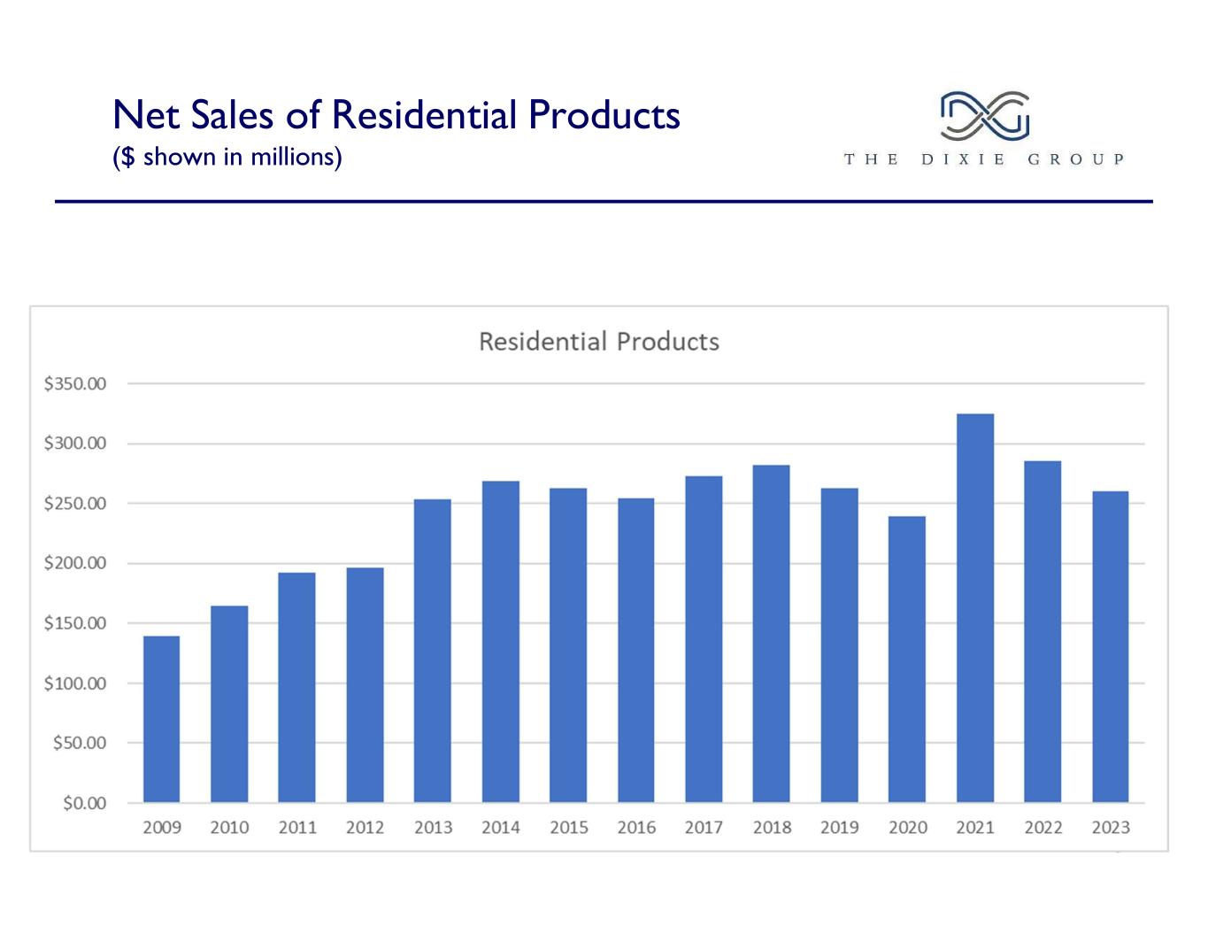 前瞻性陈述The Dixie Group, Inc. •本演示文稿中与未来相关的陈述受风险因素和不确定性的影响,可能导致实际结果与此类前瞻性陈述中所示的结果存在重大差异。这些因素包括对公司生产的产品的需求水平。其他可能影响公司业绩的因素包括但不限于与石油价格相关的原材料和运输成本、资本的成本和可用性以及与公司业务相关的一般经济和竞争条件。与能源的可用性和价格相关的问题可能会对公司的运营产生不利影响。有关这些因素和其他因素及不确定性的更多信息,可在公司提交给美国证券交易委员会的文件中找到。•本演示文稿中列出的有关美国地毯和地毯市场的市场状况、销售数据和趋势的一般信息来自各种公开来源,在某些情况下还来自非公开来源。虽然我们认为这些数据和信息是准确的,但我们没有试图独立核实这些信息。2