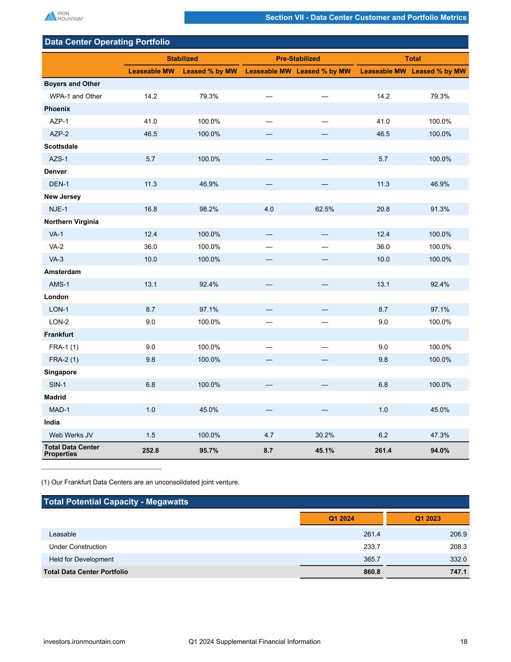 数据中心经营组合稳定预稳总可租MW租赁% by MW可租MW租赁% by MW可租MW MW租赁% by MW Boyers和其他WPA-1及其他14.279.3% —— 14.279.3% Phoenix AZP-1 41.0 100.0% —— 41.0 100.0% AZP-2 46.5 100.0% —— 46.5 100.0% Scottsdale AZS-1 5.7 100.0% —— 5.7 100.0% Denver DEN-1 11.3 46.9% —— 11.3 46.9% New Jersey NJE-1 16.8 98.2% 4.06 2.5% 20.89 1.3% Northern Virginia VA-1 12.4 100.0% —— 12.4 100.0% VA-2 36.0 100.0% —— 36.0 100.0% VA-3 10.0 100.0% —— 10.0 100.0%阿姆斯特丹AMS-1 13.19 2.4% —— 13.19 2.4% London LON-1 8.7 97.1% —— 8.7 97.1% LON-2 9.0 100.0% —— 9.0 100.0%法兰克福FRA-1(— 9.0 100.0% FRA-2(1)9.8 100.0% —— 9.8 100.0%新加坡SIN-1 6.8 100.0% —— 6.8 100.0%马德里MAD-1 1.045.0% —— 1.045.0% India Web Werks JV 1.5 100.0% 4.73 0.2% 6.247.3% Total Data Center Properties 252.895.7% 8.74 5.1% 261.49 4.0%(1)我们的法兰克福数据中心是一家未合并的合资企业。潜在总容量-兆瓦2024年第一季度2023年第一季度可出租261.4206.9在建233.7 208.3持作开发365.73 32.0数据中心总投资组合860.87 47.1第七节-数据中心客户和投资组合指标投资者。铁山网2024年第一季度补充财务信息18