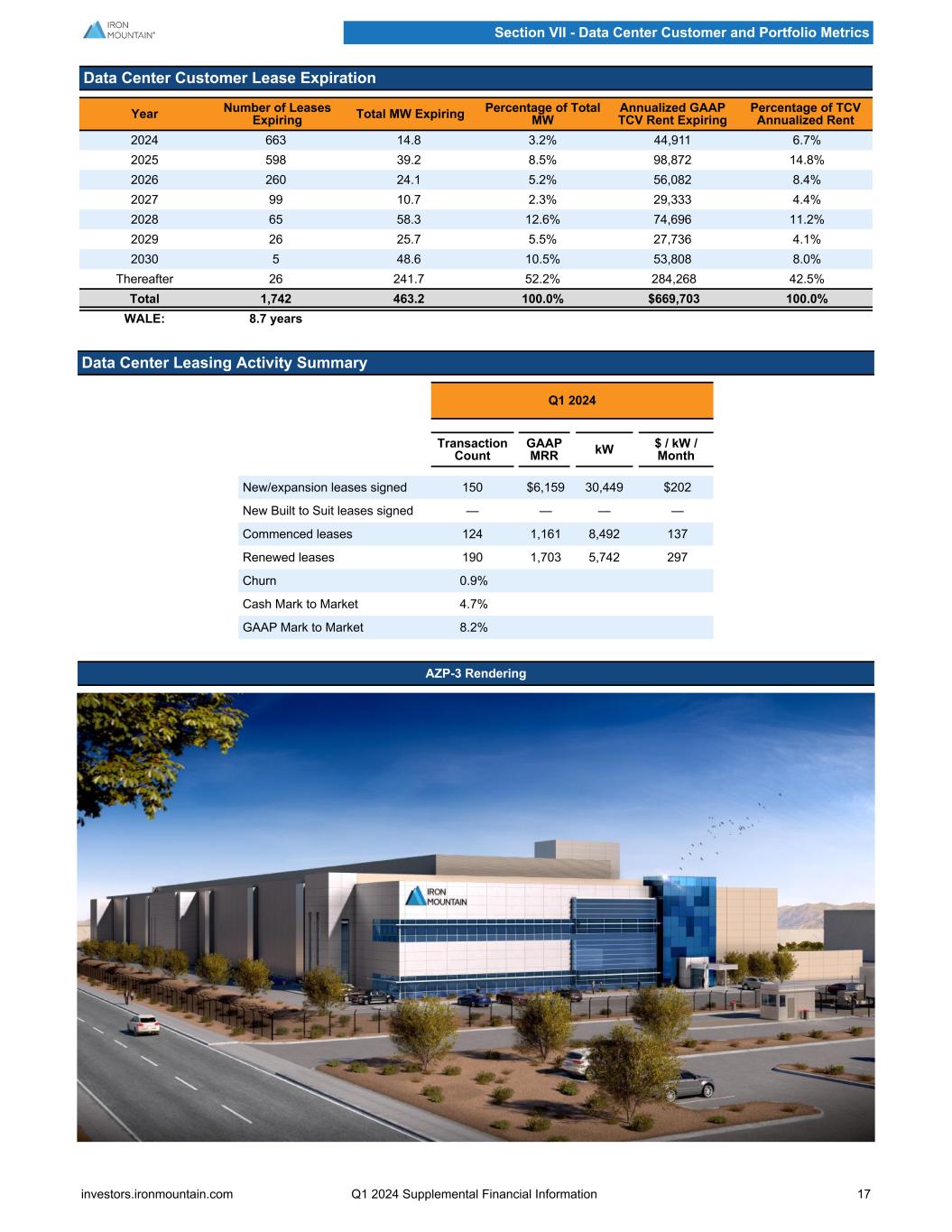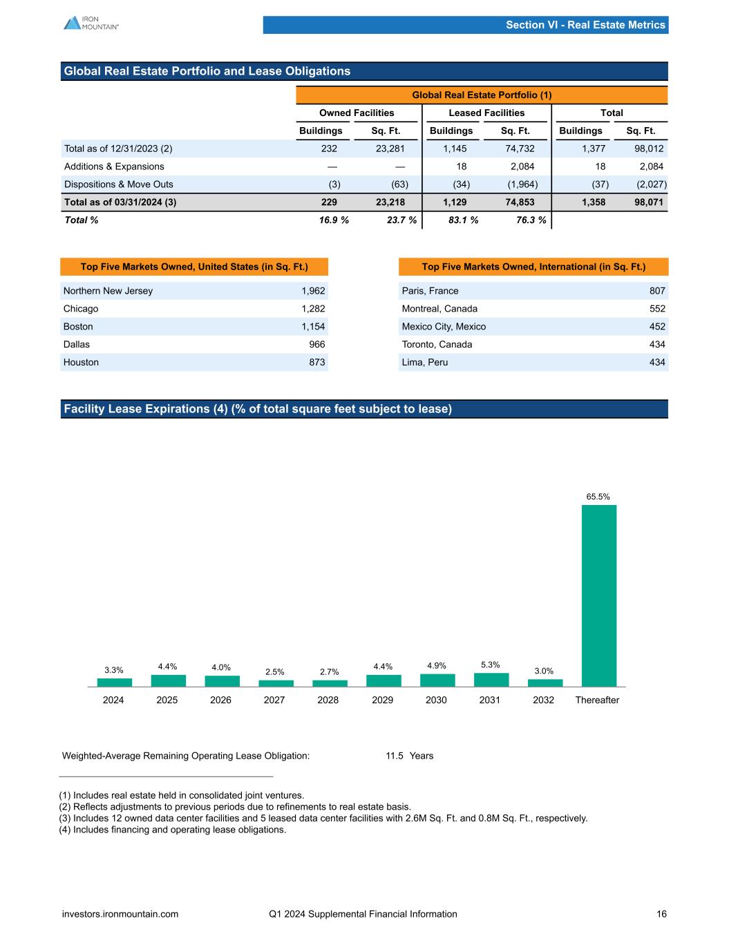 全球房地产投资组合和租赁义务全球房地产投资组合(1)自有设施租赁设施总建筑平方米。英尺。建筑SQ。英尺。建筑SQ。截至12/31/2023总计(2)23223,2811,14574,7321,37798,012新增和扩大—— 182,084182,084处置和迁出(3)(63)(34)(1,964)(37)(2,027)截至03/31/2024总计(3)22923,2181,12974,8531,35898,071合计% 16.9% 23.7% 83.1% 76.3%拥有的前五大市场,美国(按平方FT.)拥有的前五大市场,国际(单位:SQ。FT.)Northern New Jersey 1,962 Paris,France 807 Chicago 1,282 Montreal,Canada 552 Boston 1,154 Mexico City,Mexico 452 Dallas 966 Toronto,Canada 434 Houston 873 Lima,Peru 434 Facility Lease Expirations(4)(% of total square foots subject to lease)3.3% 4.4% 4.0% 2.5% 2.7% 4.4% 4.9% 5.3% 3.0% 65.5% 2024202520262027202820292029203020312032此后加权平均剩余经营租赁义务:11.5年(1)包括在合并的合资企业中持有的不动产。(2)反映对前期因地产基差细化而进行的调整。(3)包括12个自有数据中心设施和5个租赁数据中心设施,面积2.6m平方米。英尺和0.8m平方米。英尺,分别。(4)包括融资和经营租赁义务。第六节-房地产指标投资者.ironmountain.com 2024年第一季度补充财务信息16