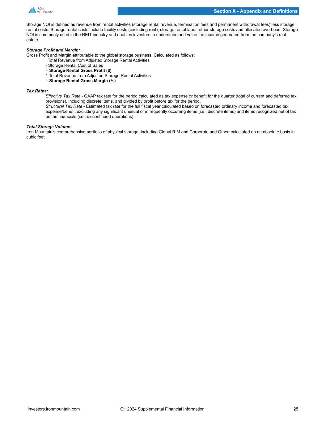 存储NOI定义为来自租赁活动的收入(存储租赁收入、终止费和永久提款费)减去存储租赁成本。仓储租赁成本包括设施成本(不含租金)、仓储租赁人工、其他仓储成本和分配的间接费用。存储NOI在REIT行业中普遍使用,使投资者能够了解和评估公司房地产产生的收入。存储利润和利润率:归属于全球存储业务的毛利和利润率。计算如下:调整后仓储租赁活动的总收入-仓储租赁销售成本=仓储租赁毛利润(美元)/调整后仓储租赁活动的总收入=仓储租赁毛利率(%)税率:有效税率-当期GAAP税率计算为本季度的税费或收益(当期和递延税项准备金合计),包括离散项目,除以当期税前利润。结构性税率-根据预测的普通收入和预测的税费/收益计算的整个财政年度的估计税率,不包括任何重大的不寻常或不经常发生的项目(即离散项目)和财务上确认的税后净额项目(即终止经营)。总存储量:铁山全面的实物存储组合,包括全球RIM和企业及其他,按绝对值计算,单位为立方英尺。第X节-附录和定义Investors.ironmountain.com 2024年第一季度补充财务信息25