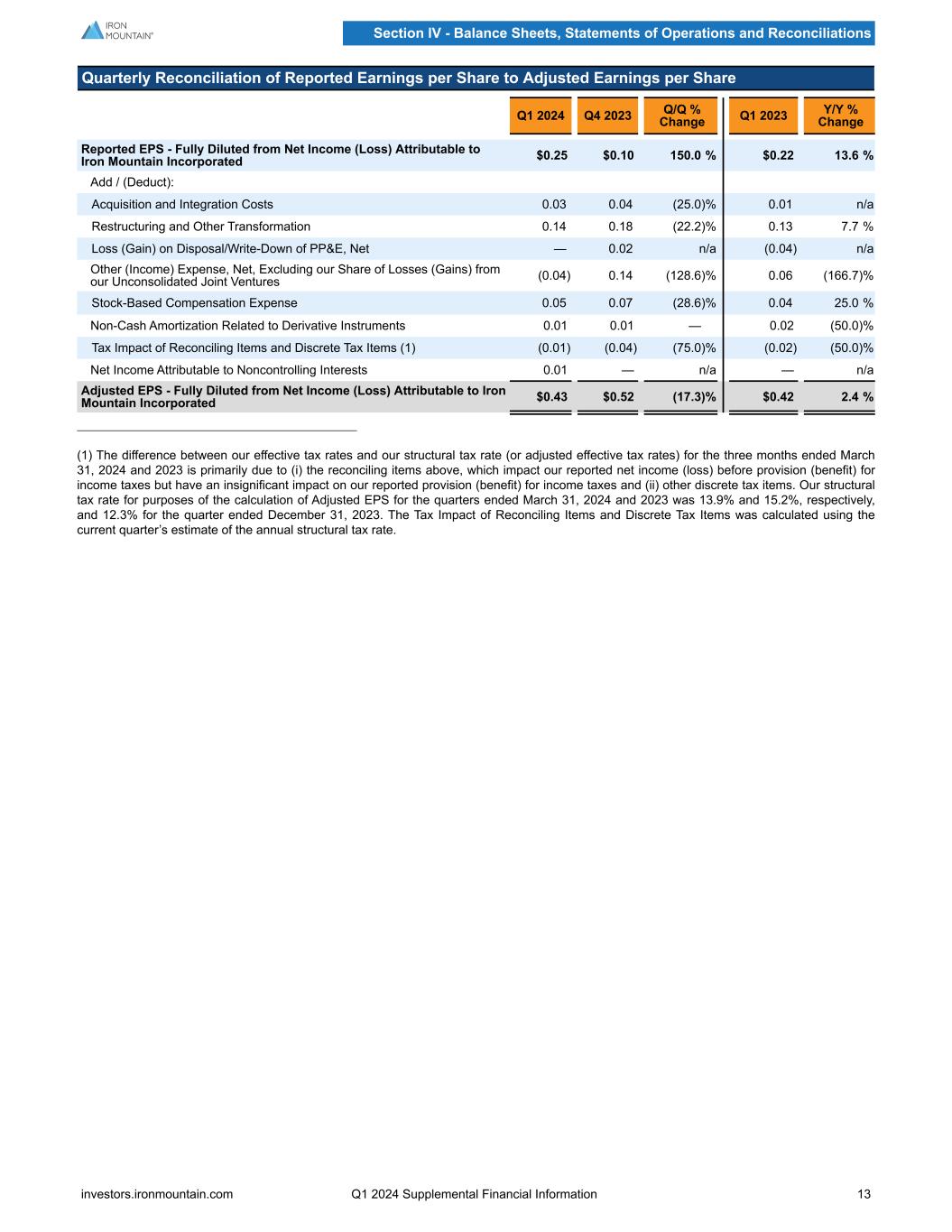 报告每股收益与调整后每股收益的季度调节2024年第一季度2023年第四季度Q3/Q %变化2023年第一季度Y/Y %变化报告每股收益-从归属于铁山公司的净收入(亏损)中完全摊薄$ 0.25 $ 0.10 150.0% $ 0.22 13.6%加/(减):收购和整合成本0.03 0.04(25.0)% 0.01 n/a重组和其他转型0.14 0.18(22.2)% 0.13 7.7%处置/减记PP & E的损失(收益)净额—0.02 n/a(0.04)n/a其他(收入)费用净额,不包括我们应占未合并合资企业的亏损(收益)(0.04)0.14(128.6)% 0.06(166.7)%以股票为基础的补偿费用0.05 0.07(28.6)% 0.04 25.0%与衍生工具相关的非现金摊销0.01 0.01 —0.02(50.0)%调节项目和离散税项的税务影响(1)(0.01)(0.04)(75.0)%(0.02)(50.0)%归属于非控股权益的净利润0.01 — n/a—n/a调整后每股收益-从归属于铁山公司的净利润(亏损)中完全摊薄$ 0.43 $ 0.52(17.3)% $ 0.42 2.4%(1)我们的有效税率之间的差额我们截至2024年3月31日和2023年3月31日止三个月的结构性税率(或调整后的有效税率)主要是由于(i)上述调节项目,这些项目影响了我们报告的所得税拨备(收益)前净收入(亏损),但对我们报告的所得税拨备(收益)和(ii)其他离散税项影响不大。为计算截至2024年3月31日和2023年3月31日的季度调整后每股收益,我们的结构性税率分别为13.9%和15.2%,截至2023年12月31日的季度为12.3%。调节项目和离散税收项目的税收影响是使用本季度对年度结构性税率的估计计算得出的。第四节-资产负债表、运营报表和和解投资者。铁山网2024年第一季度补充财务信息13