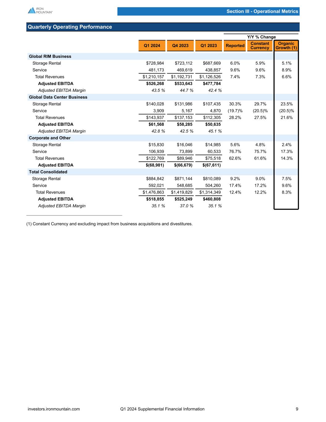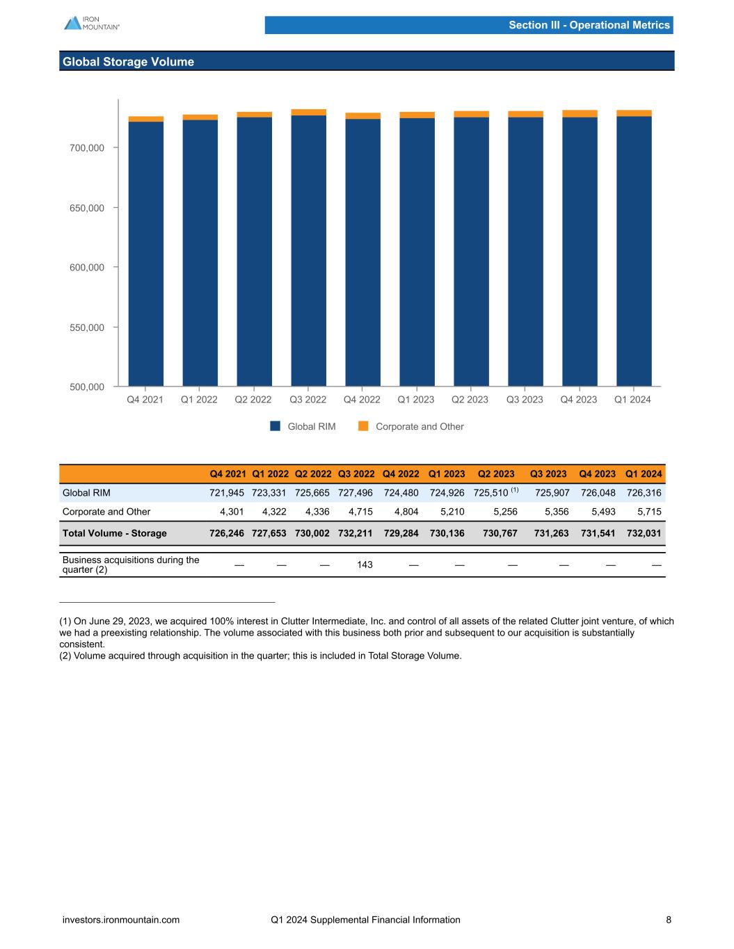 全球存储量全球RIM企业及其他Q4 2021 Q1 2022 Q2 2022 Q3 2022 Q4 2022 Q1 2023 Q2 2023 Q3 2023 Q4 2023 Q1 2024 500,000550,000600,000650,000700,000 Q4 2021 Q1 2022 Q2 2022 Q3 2022 Q4 2022 Q1 2023 Q2 2023 Q3 2023 Q4 2023 Q1 2024 Global RIM 721,945723,331725,665727,496724,480724,926725,510(1)725,907726,048726,316企业及其他4,3014,3224,3364,7154,8045,2105,2565,3565,4935,715总成交量-存储726,246727,653730,002732,211729,284730,136730,767731,263731,541732,031本季度的业务收购(2)———— 143 ——————(1)2023年6月29日,我们收购了Clutter Intermediate,Inc.的100%权益,并控制了相关Clutter合资公司的所有资产,其中我们已有一项预先存在的关系。在我们收购之前和之后,与这项业务相关的交易量基本上是一致的。(2)本季度通过收购获得的数量;这包括在总存储量中。第三节-运营指标投资者.ironmountain.com 2024年第一季度补充财务信息8