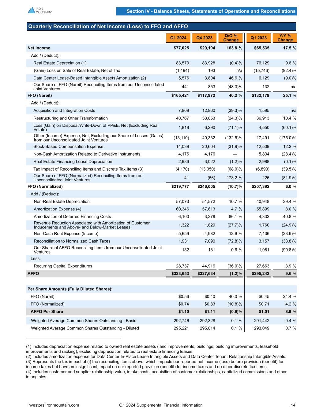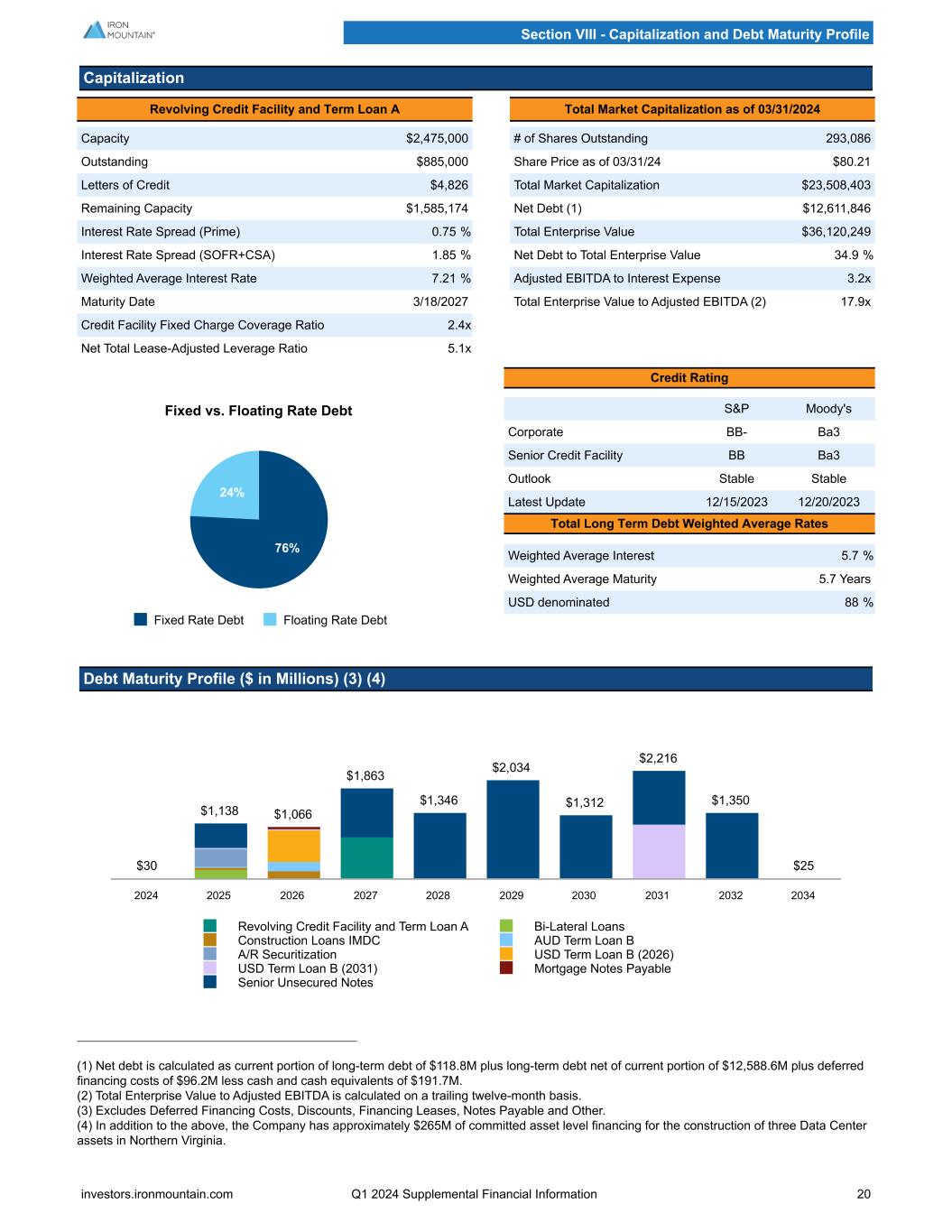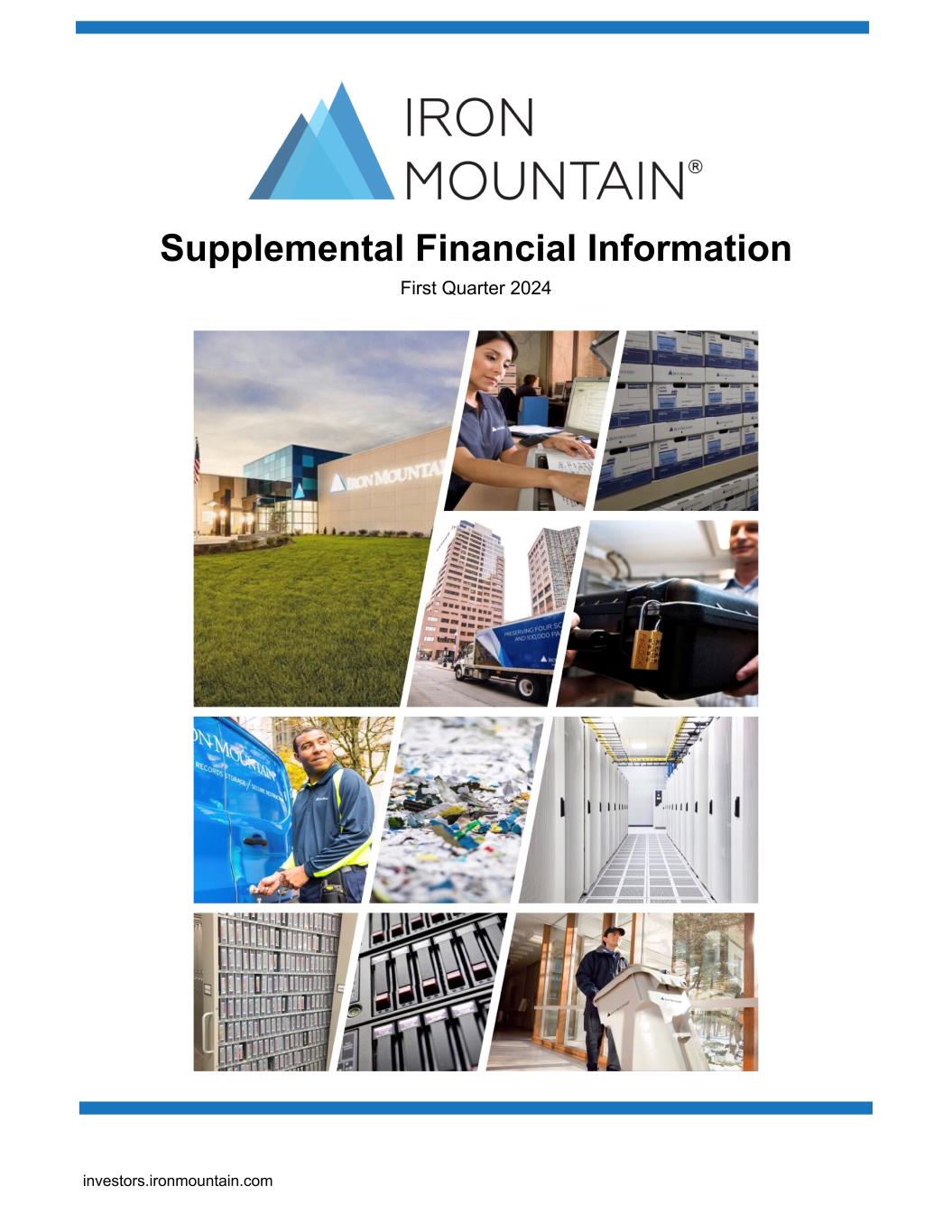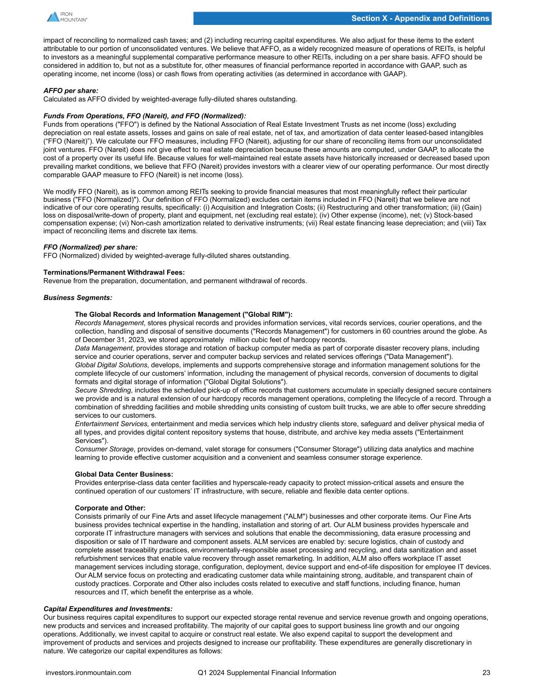 与正常化现金税对账的影响;以及(2)包括经常性资本支出。我们还对这些项目进行了调整,调整幅度可归因于我们的未合并风险投资部分。我们认为,AFFO作为一种被广泛认可的REITs运营衡量指标,有助于投资者作为对其他REITs的一种有意义的补充比较业绩衡量指标,包括在每股基础上。AFFO应被视为对根据GAAP报告的财务业绩的其他衡量标准的补充,而不是替代,例如营业收入、净收入(亏损)或经营活动产生的现金流量(根据GAAP确定)。每股AFFO:计算方法为AFFO除以加权平均全面摊薄流通股。来自运营、FFO(Nareit)和FFO(Normalized)的资金:运营资金(“FFO”)由全国房地产投资信托协会定义为不包括房地产资产折旧、出售房地产的损失和收益、税后净额以及数据中心租赁无形资产摊销(“FFO(Nareit)”)的净收入(亏损)。我们计算我们的FFO措施,包括FFO(Nareit),根据我们在未合并的合资企业的调节项目中所占份额进行调整。FFO(Nareit)不会对房地产折旧产生影响,因为这些金额是根据公认会计原则计算的,用于在物业的使用寿命内分配成本。由于历史上维护良好的房地产资产的价值会根据当时的市场状况而增加或减少,我们认为FFO(Nareit)为投资者提供了更清晰的关于我们经营业绩的观点。我们与FFO(Nareit)最直接可比的GAAP衡量标准是净收入(亏损)。我们修改FFO(Nareit),这在寻求提供最有意义地反映其特定业务的财务指标(“FFO(Normalized)”)的REITs中很常见。我们对FFO(正常化)的定义不包括FFO(Nareit)中包含的某些我们认为不代表我们核心经营业绩的项目,具体而言:(i)收购和整合成本;(ii)重组和其他转型;(iii)(收益)物业、厂房和设备的处置/减记损失,净额(不包括房地产);(iv)其他费用(收入),净额;(v)基于股票的补偿费用;(vi)与衍生工具相关的非现金摊销;(vii)房地产融资租赁折旧;(viii)调节项目和离散税项的税务影响。每股FFO(标准化):FFO(标准化)除以加权平均完全稀释流通股。终止/永久退出费用:收入从准备,文件,和永久撤回记录。业务分部:The Global Records and Information Management(“Global RIM”):Records Management,存储实体记录并为全球60个国家的客户提供信息服务、生命记录服务、快递业务以及敏感文件的收集、处理和处置(“Records Management”)。截至2023年12月31日,我们存储了大约百万立方英尺的硬拷贝记录。数据管理,作为企业灾难恢复计划的一部分,提供备份计算机媒体的存储和轮换,包括服务和快递操作、服务器和计算机备份服务以及相关服务产品(“数据管理”)。Global Digital Solutions,为客户信息的整个生命周期开发、实施和支持全面的存储和信息管理解决方案,包括管理物理记录、将文档转换为数字格式以及信息的数字存储(“Global Digital Solutions”)。Secure Shredding,包括客户在我们提供的专门设计的安全容器中积累的办公记录的预定提取,是我们硬拷贝记录管理操作的自然延伸,完成记录的生命周期。通过粉碎设施和由定制卡车组成的移动粉碎单元的组合,我们能够为我们的客户提供安全的粉碎服务。娱乐服务、娱乐和媒体服务,帮助行业客户存储、保护和交付所有类型的物理媒体,并提供容纳、分发和归档关键媒体资产的数字内容存储库系统(“娱乐服务”)。Consumer Storage,利用数据分析和机器学习为消费者提供按需、代客泊车存储(“Consumer Storage”),以提供有效的客户获取和方便、无缝的消费者存储体验。全球数据中心业务:提供企业级数据中心设施和超大规模就绪能力,以保护关键任务资产并确保我们客户的IT基础设施持续运行,具有安全、 可靠且灵活的数据中心选项。公司及其他:主要包括我们的美术和资产生命周期管理(“ALM”)业务和其他公司项目。我们的美术业务在艺术品的搬运、安装和储存方面提供技术专长。我们的ALM业务为超大规模和企业IT基础设施管理人员提供服务和解决方案,使IT硬件和组件资产能够退役、数据擦除处理和处置或出售。ALM服务通过以下方式实现:安全物流、监管链和完整的资产溯源实践、对环境负责的资产处理和回收,以及通过资产再营销实现价值回收的数据净化和资产翻新服务。此外,ALM还为员工IT设备提供工作场所IT资产管理服务,包括存储、配置、部署、设备支持和报废处置。我们的ALM服务专注于保护和消除客户数据,同时保持强大、可审计和透明的监管链实践。Corporate and Other还包括与行政和员工职能相关的成本,包括财务、人力资源和IT,这些对企业整体有利。资本支出和投资:我们的业务需要资本支出来支持我们预期的存储租赁收入和服务收入增长以及持续运营、新产品和服务以及盈利能力的提高。我们的大部分资本用于支持业务线增长和我们正在进行的运营。此外,我们投入资本收购或建设房地产。我们还花费资本来支持旨在提高我们盈利能力的产品和服务以及项目的开发和改进。这些支出通常是可自由支配的。我们将资本支出分类如下:第X节-附录和定义投资者。铁山网2024年第一季度补充财务信息23