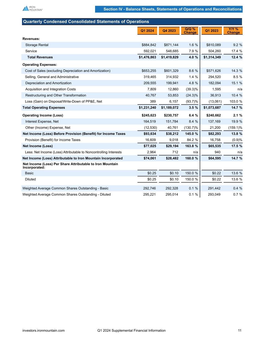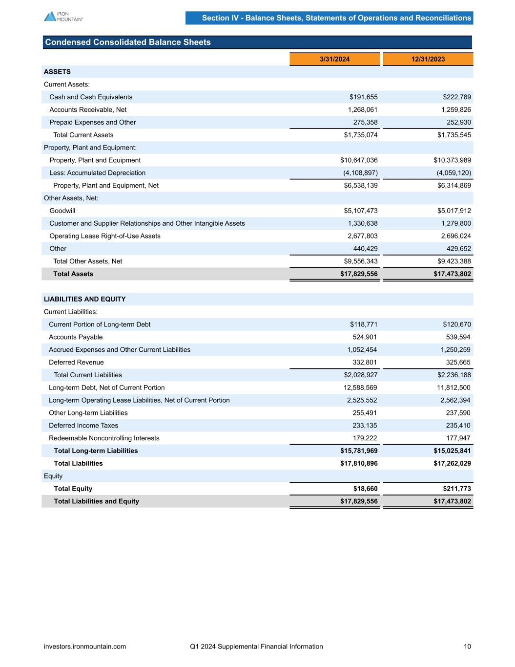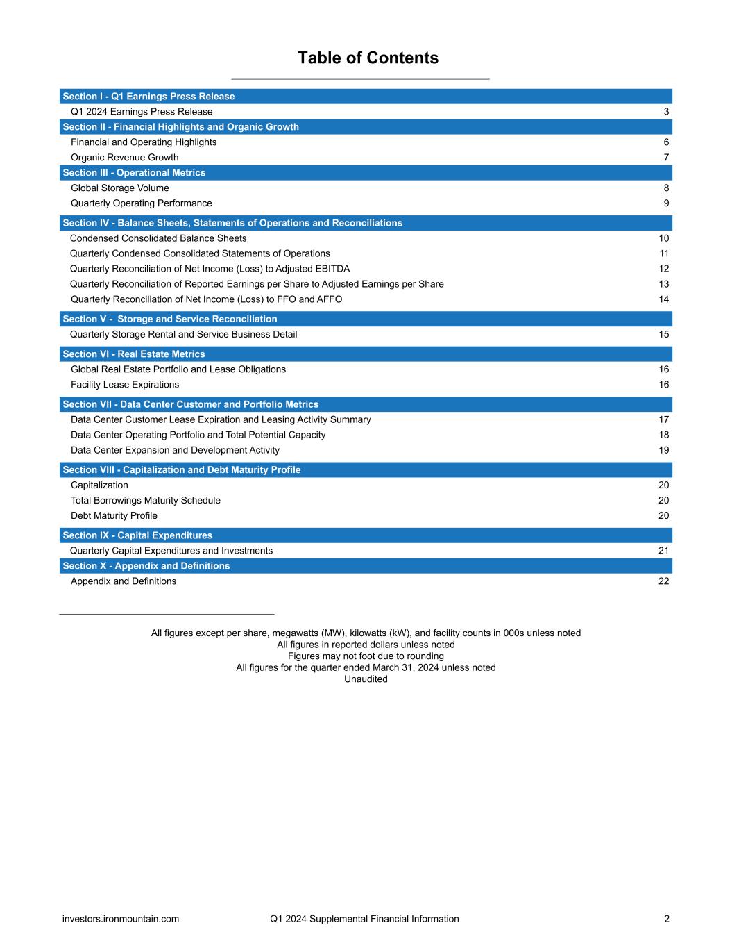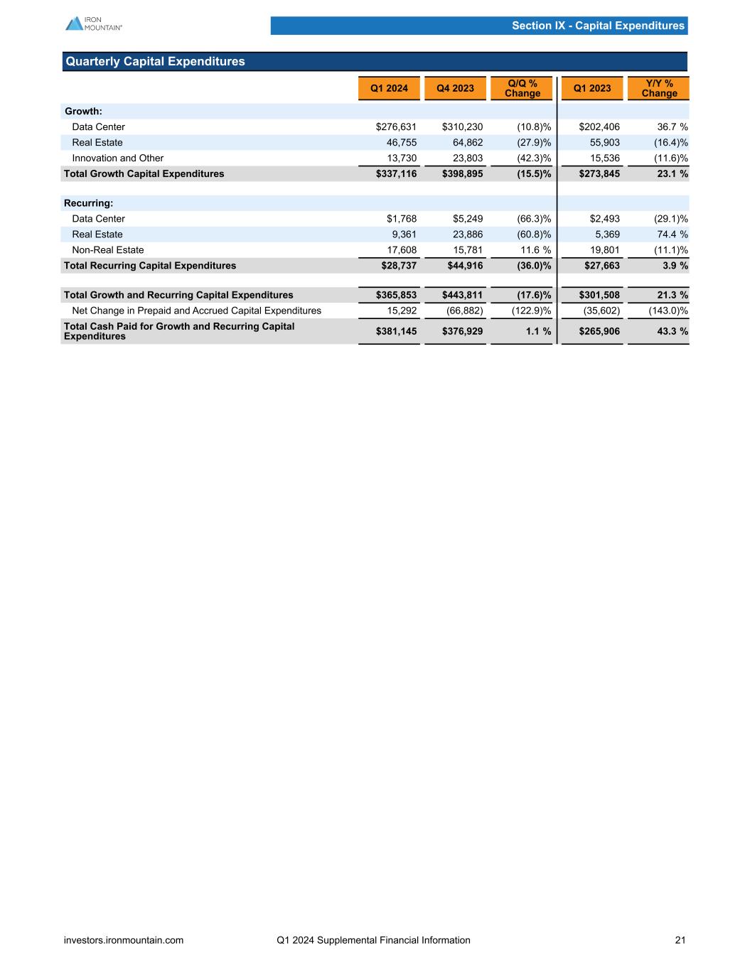与正常化现金税对账的影响;以及(2)包括经常性资本支出。我们还对这些项目进行了调整,调整幅度可归因于我们的未合并风险投资部分。我们认为,AFFO作为一种被广泛认可的REITs运营衡量指标,有助于投资者作为对其他REITs的一种有意义的补充比较业绩衡量指标,包括在每股基础上。AFFO应被视为对根据GAAP报告的财务业绩的其他衡量标准的补充,而不是替代,例如营业收入、净收入(亏损)或经营活动产生的现金流量(根据GAAP确定)。每股AFFO:计算方法为AFFO除以加权平均全面摊薄流通股。来自运营、FFO(Nareit)和FFO(Normalized)的资金:运营资金(“FFO”)由全国房地产投资信托协会定义为不包括房地产资产折旧、出售房地产的损失和收益、税后净额以及数据中心租赁无形资产摊销(“FFO(Nareit)”)的净收入(亏损)。我们计算我们的FFO措施,包括FFO(Nareit),根据我们在未合并的合资企业的调节项目中所占份额进行调整。FFO(Nareit)不会对房地产折旧产生影响,因为这些金额是根据公认会计原则计算的,用于在物业的使用寿命内分配成本。由于历史上维护良好的房地产资产的价值会根据当时的市场状况而增加或减少,我们认为FFO(Nareit)为投资者提供了更清晰的关于我们经营业绩的观点。我们与FFO(Nareit)最直接可比的GAAP衡量标准是净收入(亏损)。我们修改FFO(Nareit),这在寻求提供最有意义地反映其特定业务的财务指标(“FFO(Normalized)”)的REITs中很常见。我们对FFO(正常化)的定义不包括FFO(Nareit)中包含的某些我们认为不代表我们核心经营业绩的项目,具体而言:(i)收购和整合成本;(ii)重组和其他转型;(iii)(收益)物业、厂房和设备的处置/减记损失,净额(不包括房地产);(iv)其他费用(收入),净额;(v)基于股票的补偿费用;(vi)与衍生工具相关的非现金摊销;(vii)房地产融资租赁折旧;(viii)调节项目和离散税项的税务影响。每股FFO(标准化):FFO(标准化)除以加权平均完全稀释流通股。终止/永久退出费用:收入从准备,文件,和永久撤回记录。业务分部:The Global Records and Information Management(“Global RIM”):Records Management,存储实体记录并为全球60个国家的客户提供信息服务、生命记录服务、快递业务以及敏感文件的收集、处理和处置(“Records Management”)。截至2023年12月31日,我们存储了大约百万立方英尺的硬拷贝记录。数据管理,作为企业灾难恢复计划的一部分,提供备份计算机媒体的存储和轮换,包括服务和快递操作、服务器和计算机备份服务以及相关服务产品(“数据管理”)。Global Digital Solutions,为客户信息的整个生命周期开发、实施和支持全面的存储和信息管理解决方案,包括管理物理记录、将文档转换为数字格式以及信息的数字存储(“Global Digital Solutions”)。Secure Shredding,包括客户在我们提供的专门设计的安全容器中积累的办公记录的预定提取,是我们硬拷贝记录管理操作的自然延伸,完成记录的生命周期。通过粉碎设施和由定制卡车组成的移动粉碎单元的组合,我们能够为我们的客户提供安全的粉碎服务。娱乐服务、娱乐和媒体服务,帮助行业客户存储、保护和交付所有类型的物理媒体,并提供容纳、分发和归档关键媒体资产的数字内容存储库系统(“娱乐服务”)。Consumer Storage,利用数据分析和机器学习为消费者提供按需、代客泊车存储(“Consumer Storage”),以提供有效的客户获取和方便、无缝的消费者存储体验。全球数据中心业务:提供企业级数据中心设施和超大规模就绪能力,以保护关键任务资产并确保我们客户的IT基础设施持续运行,具有安全、 可靠且灵活的数据中心选项。公司及其他:主要包括我们的美术和资产生命周期管理(“ALM”)业务和其他公司项目。我们的美术业务在艺术品的搬运、安装和储存方面提供技术专长。我们的ALM业务为超大规模和企业IT基础设施管理人员提供服务和解决方案,使IT硬件和组件资产能够退役、数据擦除处理和处置或出售。ALM服务通过以下方式实现:安全物流、监管链和完整的资产溯源实践、对环境负责的资产处理和回收,以及通过资产再营销实现价值回收的数据净化和资产翻新服务。此外,ALM还为员工IT设备提供工作场所IT资产管理服务,包括存储、配置、部署、设备支持和报废处置。我们的ALM服务专注于保护和消除客户数据,同时保持强大、可审计和透明的监管链实践。Corporate and Other还包括与行政和员工职能相关的成本,包括财务、人力资源和IT,这些对企业整体有利。资本支出和投资:我们的业务需要资本支出来支持我们预期的存储租赁收入和服务收入增长以及持续运营、新产品和服务以及盈利能力的提高。我们的大部分资本用于支持业务线增长和我们正在进行的运营。此外,我们投入资本收购或建设房地产。我们还花费资本来支持旨在提高我们盈利能力的产品和服务以及项目的开发和改进。这些支出通常是可自由支配的。我们将资本支出分类如下:第X节-附录和定义投资者。铁山网2024年第一季度补充财务信息23