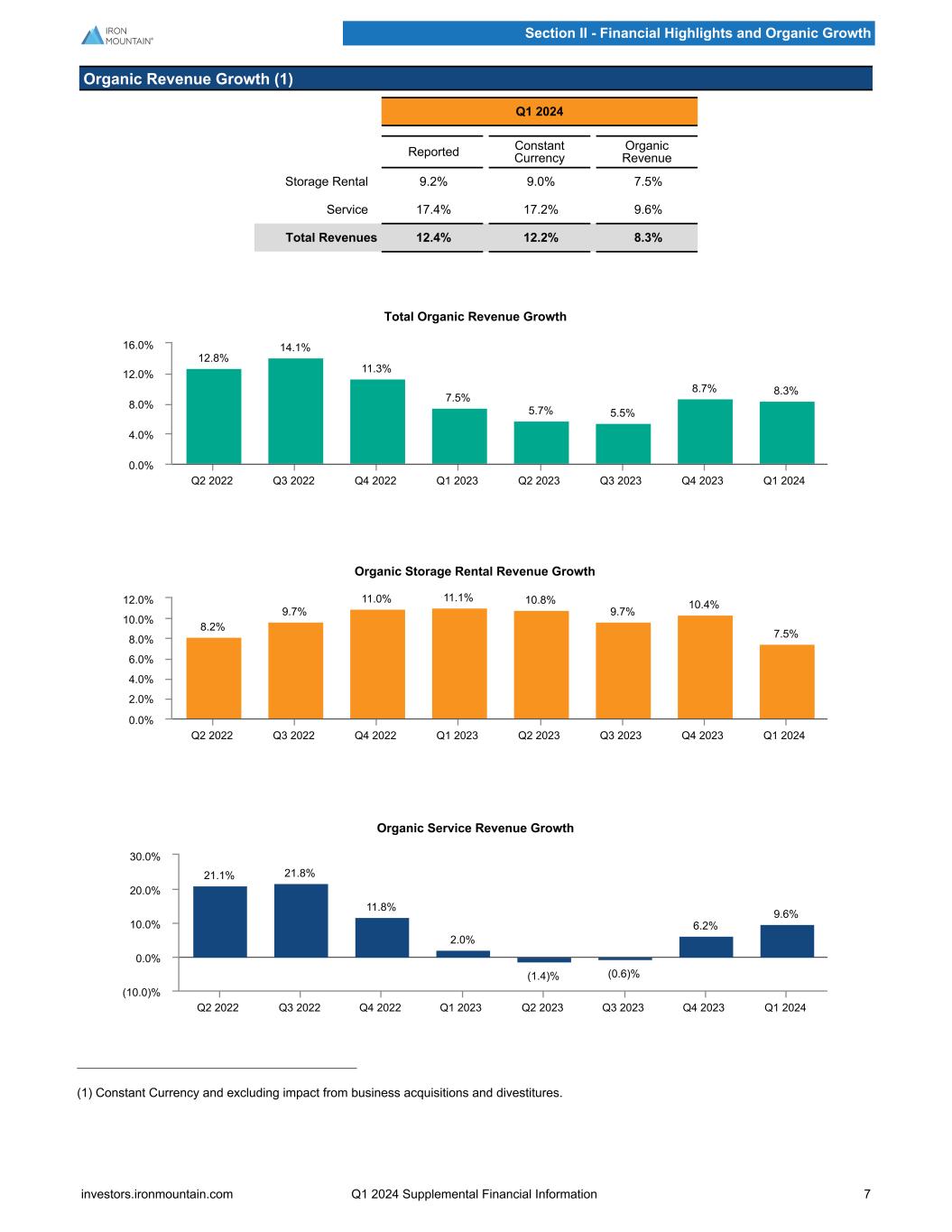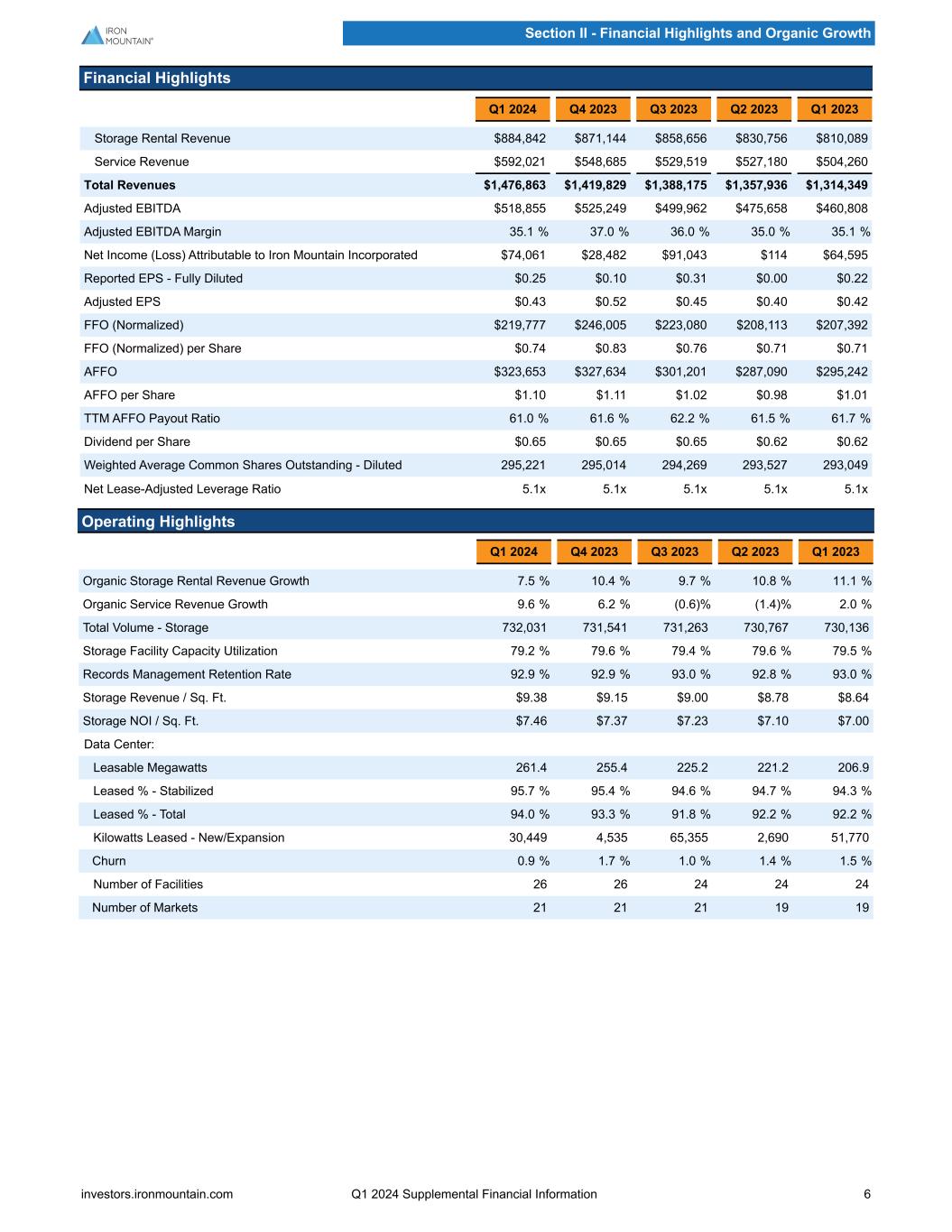2024 Q1 Q4 2023 Q3 2023 Q2 2023 Q1 2023 Storage Rental Revenue $ 884,842 $ 871,144 $ 858,656 $ 830,756 $ 810,089 Service Revenue $ 592,021 $ 548,685 $ 529,519 $ 527,180 $ 504,260 Total Revenues $ 1,476,863 $ 1,419,829 $ 1,388,175 $ 1,357,936 $ 1,314,349 Adjusted EBITDA $ 518,855 $ 525,249 $ 499,962 $ 475,658 $ 460,808 Adjusted EBITDA Margin 35.1% 37.0% 36.0% 35.0% Net income(loss)attribable to 铁山公司 $ 74,061 $ 28AFFO323,653美元327,634美元301,201美元287,090美元295,242美元每股AFFO1.10美元1.11美元1.02美元0.98美元1.01美元TTM AFFOO派息率61.0% 61.6% 62.2% 61.5% 61.7%每股股息0.65美元0.65美元0.65美元0.62美元0.62美元加权平均已发行普通股-稀释后295,221295,014294,269293,527293,049净租赁调整杠杆率5.1x 5.1x 5.1x 5.1x 5.1x 5.1x经营亮点Q1 2024 Q4 2023 Q3 2023 Q2 2023 Q1有机存储租赁收入增长7.5% 10.4% 9.7% 10.8% 11.1%有机服务收入增长9.6% 6.2%(0.6)%(1.4)% 2.0%合计体积-存储732,031731,541731,263730,767730,136存储设施容量利用率79.2% 79.6% 79.4% 79.6% 79.5%记录管理保留率92.9% 92.9% 93.0% 92.8% 93.0%存储收入/平方米。英尺。9.38美元9.15美元9.00美元8.78美元8.64美元存储NOI/SQ。英尺。7.46美元7.37美元7.23美元7.10美元7.00美元数据中心:可租赁兆瓦261.4255.42 25.22 21.2206.9租赁%-稳定95.7% 95.4% 94.6% 94.7% 94.3%租赁%-总计94.0% 93.3% 91.8% 92.2% 92.2%租赁千瓦-新/扩建30,4494,53565,3552,69051,770流失率0.9% 1.7% 1.0% 1.4% 1.5%设施数量262626242424市场数量2121211919第二节-财务亮点和有机增长投资者。铁山网2024年第一季度补充财务信息6