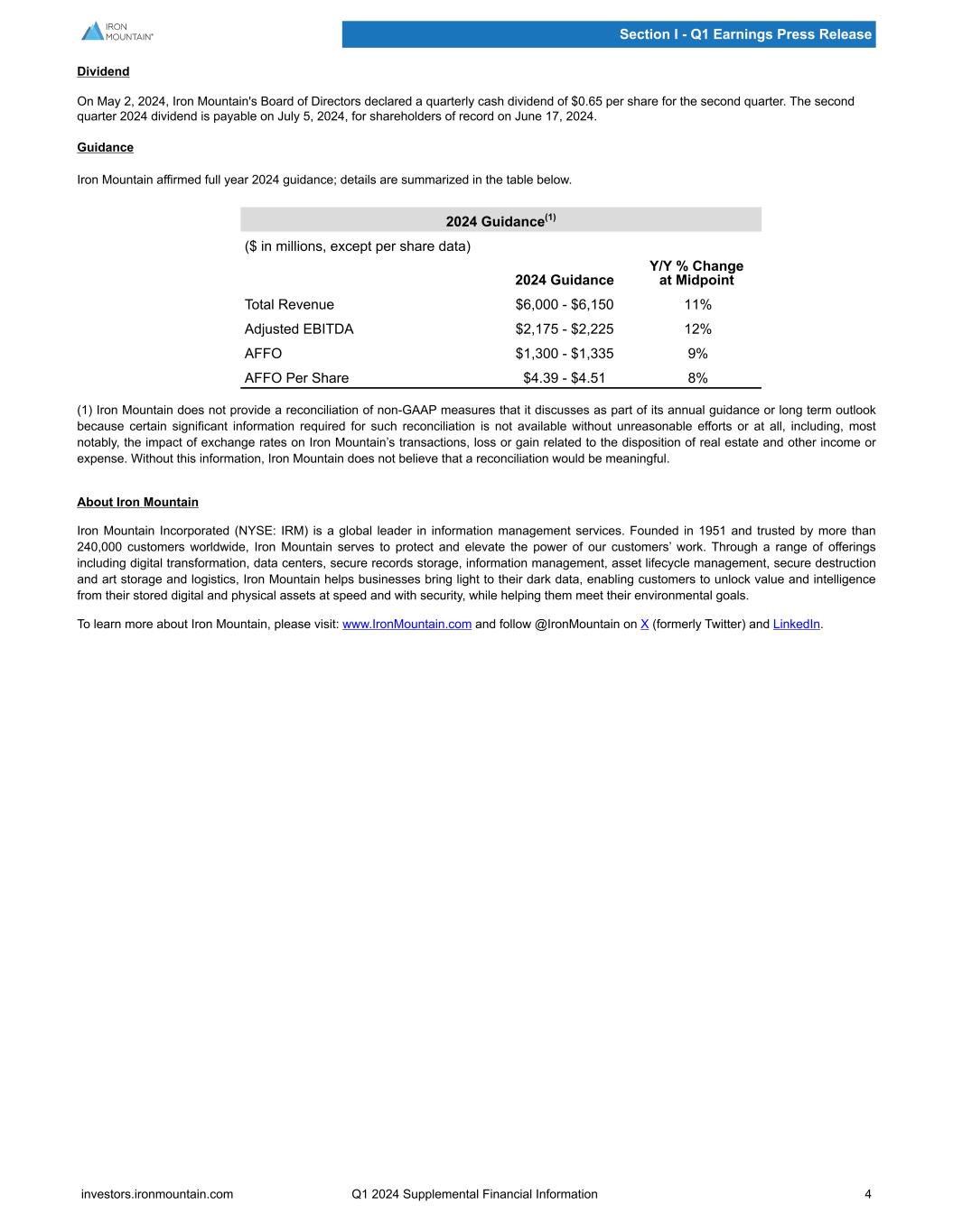 2024年5月2日的股息,铁山董事会宣布第二季度的季度现金股息为每股0.65美元。2024年第二季度股息将于2024年7月5日支付,适用于2024年6月17日登记在册的股东。指导意见铁山确认了2024年全年指导意见;详情汇总于下表。2024年指导(1)(百万美元,每股数据除外)2024年指导Y/Y %中点变化总收入6000美元-6,150美元11%调整后EBITDA 2,175美元-2,22512% AFFO1,300美元-1335美元9% AFFO1股4.39美元-4.51美元8%(1)铁山没有提供其作为年度指导或长期前景的一部分而讨论的非公认会计原则措施的对账,因为这种对账所需的某些重要信息如果没有不合理的努力或根本无法获得,其中最值得注意的包括汇率对铁山交易的影响,与处置不动产和其他收入或费用有关的损失或收益。没有这些信息,铁山认为和解是没有意义的。关于铁山铁山公司(NYSE:IRM)是信息管理服务领域的全球领先企业。铁山成立于1951年,受到全球超过24万家客户的信赖,服务于守护和提升客户工作的力量。通过包括数字化转型、数据中心、安全记录存储、信息管理、资产生命周期管理、安全销毁以及艺术品存储和物流在内的一系列产品,铁山帮助商家为其黑暗数据带来光明,使客户能够从其存储的数字和实物资产中快速、安全地解锁价值和智能,同时帮助他们实现环境目标。想了解更多关于铁山的信息,请访问:www.IronMountain.com,在X(原推特)和领英上关注@ ironMountain。第一节-第一季度收益新闻稿投资者.ironmountain.com 2024年第一季度补充财务信息4