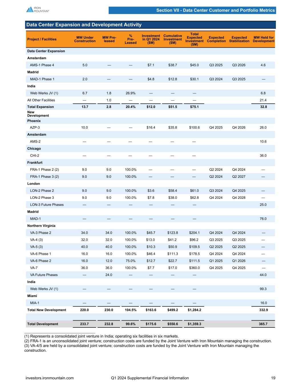 数据中心扩建和开发活动项目/设施在建MW预租% 2024年第一季度预租投资(百万美元)累计投资(百万美元)预期投资总额(百万美元)预期完成预期稳定持有MW用于开发数据中心扩建阿姆斯特丹AMS-1第4期5.0 —— 7.1美元38.7美元45.0 Q3 2025 Q3 20264.6马德里MAD-1第1期2.0 —— 4.8美元12.8美元30.1 Q3 2024 Q3 2025 — India Web Werks JV(1)6.7 1.8 26.9% ———— 6.8所有其他设施—— 1.0 ———— 21.4总扩建13.7 2.82 0.4% 12.0美元51.5美元75.13 2.8新开发Phoenix AZP-3 10.0 —— 16.4美元35.8美元100.6 Q4 2025 Q4 202626.0阿姆斯特丹AMS-2 —————— 10.6芝加哥CHI-2 —————— 36.0法兰克福FRA-1 Phase 2(2)9.09.0 100.0% ———— Q2 2024 Q4 2024 — FRA-1 Phase 3(2)9.09.0 100.0% ———— Q2 2024 Q2 2027 — London LON-2 Phase 2 9.09.0 100.0% $ 3.6 $ 58.4 $ 61.0 Q3 2024 Q4 2025 — LON-2 Phase 3 9.09.0 100.0% $ 7.8 $ 38.0 $ 62.8 Q4 2024 Q4 2028 — LON-3 Future Phases —————— 25.0 Madrid MAD-1 ———— 76.0 Northern Virginia VA-3 Phase 2 34.03 4.0 100.0% $ 45.7 $ 123.8 $ 204.1 Q4 2024 Q4 2024 — VA-4(3)32.03 2.0 100.0%$ 13.0 $ 41.2 $ 96.2 Q3 2025 Q3 2025 — VA-5(3)40.04 0.0 100.0% $ 10.3 $ 50.9 $ 109.5 Q2 2025 Q2 2025 — VA-6 Phase 1 16.0 16.0 100.0% $ 46.4 $ 111.3 $ 178.5 Q4 2024 Q4 2024 — VA-6 Phase 2 16.01 2.075.0% $ 12.7 $ 22.7 $ 111.5 Q1 2025 Q1 2026 — VA-7 36.03 6.0 100.0% $ 7.7 $ 17.0 $ 360.0 Q4 2025 Q4 2025 — VA Future Phases — 24.0 ———— 44.0 India Web Werks JV(1)—————— 99.3 Miami MIA-1 —————— 16.0 Total New Development 220.02 30.0 104.5% $ 163.6$ 499.2 $ 1,284.233 2.9 Total Development 233.7232.899.6% $ 175.6 $ 550.6 $ 1,359.3365.7(1)代表在印度的合并合资企业;在六个市场运营六个设施。(2)FRA-1是一家未合并的合资企业;建设费用由合资企业出资,由铁山管理建设。(3)VA-4/5由合并后的合资企业持有;建设费用由合资企业出资,由铁山管理建设。第七节-数据中心客户和投资组合指标投资者.ironmountain.com 2024年第一季度补充财务信息19
