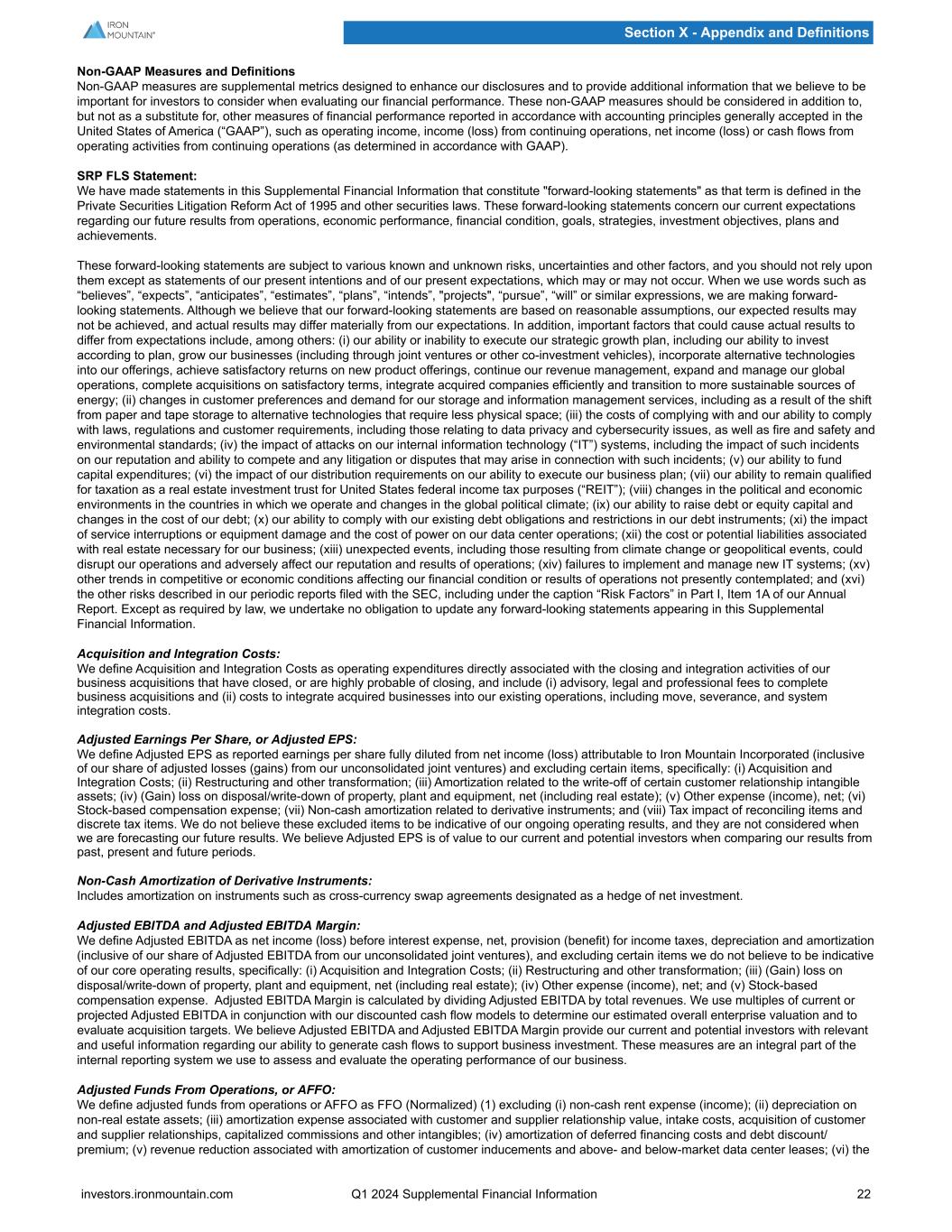 非GAAP措施和定义非GAAP措施是补充指标,旨在加强我们的披露,并提供我们认为对投资者在评估我们的财务业绩时考虑的重要信息。这些非公认会计原则衡量标准应作为根据美利坚合众国普遍接受的会计原则(“公认会计原则”)报告的财务业绩的其他衡量标准的补充而非替代考虑,例如营业收入、来自持续经营业务的收入(亏损)、净收入(亏损)或来自持续经营业务的经营活动现金流量(根据公认会计原则确定)。SRP FLS声明:我们在本补充财务信息中所作的声明构成了“前瞻性陈述”,该术语在1995年《私人证券诉讼改革法案》和其他证券法中定义。这些前瞻性陈述涉及我们目前对未来运营结果、经济表现、财务状况、目标、战略、投资目标、计划和成就的预期。这些前瞻性陈述受制于各种已知和未知的风险、不确定性和其他因素,您不应依赖它们,除非作为我们当前意图和我们当前预期的陈述,这些陈述可能会发生,也可能不会发生。当我们使用“相信”、“预期”、“预期”、“估计”、“计划”、“打算”、“项目”、“追求”、“将”等词语或类似表述时,我们是在做出前瞻性陈述。尽管我们认为我们的前瞻性陈述是基于合理的假设,但我们的预期结果可能无法实现,实际结果可能与我们的预期存在重大差异。此外,可能导致实际结果与预期不同的重要因素包括,除其他外:(i)我们是否有能力执行我们的战略增长计划,包括我们是否有能力按照计划进行投资、发展我们的业务(包括通过合资企业或其他共同投资工具)、将替代技术纳入我们的产品、在新产品供应方面实现令人满意的回报、继续我们的收入管理、扩大和管理我们的全球业务、以令人满意的条件完成收购,高效整合被收购公司并过渡到更可持续的能源;(ii)客户对我们的存储和信息管理服务的偏好和需求发生变化,包括由于从纸张和磁带存储转向需要更少物理空间的替代技术;(iii)遵守法律、法规和客户要求的成本以及我们遵守这些要求的能力,包括与数据隐私和网络安全问题以及消防和安全及环境标准相关的成本;(iv)攻击对我们内部信息技术(“IT”)系统的影响,包括此类事件对我们的声誉和竞争能力的影响以及任何诉讼或纠纷与此类事件相关可能出现的情况;(v)我们为资本支出提供资金的能力;(vi)我们的分配要求对我们执行业务计划的能力的影响;(vii)我们作为美国联邦所得税目的的房地产投资信托基金(“REIT”)保持纳税资格的能力;(viii)我们经营所在国家的政治和经济环境的变化以及全球政治气候的变化;(ix)我们筹集债务或股权资本的能力以及我们债务成本的变化;(x)我们遵守现有债务义务和债务工具限制的能力;(xi)服务中断或设备损坏以及电力成本对我们数据中心运营的影响;(xii)与我们业务所需的房地产相关的成本或潜在负债;(xiii)意外事件,包括气候变化或地缘政治事件导致的事件,可能扰乱我们的运营,并对我们的声誉和经营业绩产生不利影响;(xiv)未能实施和管理新的IT系统;(xv)竞争或经济条件的其他趋势影响我们的财务状况或目前未考虑的经营业绩;(xvi)我们向SEC提交的定期报告中描述的其他风险,包括我们年度报告第一部分第1A项中“风险因素”标题下的风险。除法律要求外,我们不承担更新本补充财务信息中出现的任何前瞻性陈述的义务。收购和整合成本:我们将收购和整合成本定义为与我们已完成或极有可能完成的业务收购的关闭和整合活动直接相关的运营支出,包括(i)咨询、 完成业务收购的法律和专业费用,以及(ii)将收购的业务整合到我们现有业务中的成本,包括搬迁、遣散和系统整合成本。调整后每股收益,或调整后每股收益:我们将调整后每股收益定义为从归属于铁山公司的净收入(亏损)(包括我们应占未合并的合资企业的调整后亏损(收益)中完全摊薄的报告每股收益,不包括某些项目,具体而言:(i)收购和整合成本;(ii)重组和其他转型;(iii)与注销某些客户关系无形资产有关的摊销;(iv)处置/减记物业、厂房及设备的(收益)亏损净额(包括不动产);(v)其他费用(收入),净额;(vi)基于股票的补偿费用;(vii)与衍生工具相关的非现金摊销;(viii)调节项目和离散税项的税务影响。我们不认为这些被排除的项目表明我们的持续经营业绩,我们在预测未来业绩时也不会考虑这些项目。我们认为,在比较我们过去、现在和未来期间的结果时,调整后的每股收益对我们当前和潜在的投资者来说是有价值的。衍生工具的非现金摊销:包括指定为净投资对冲的交叉货币互换协议等工具的摊销。调整后EBITDA和调整后EBITDA利润率:我们将调整后EBITDA定义为扣除利息费用、净额、所得税、折旧和摊销的拨备(收益)(包括我们在未合并合资企业的调整后EBITDA中所占份额)前的净收入(亏损),不包括我们认为不能反映我们核心经营业绩的某些项目,具体而言:(i)收购和整合成本;(ii)重组和其他转型;(iii)物业、厂房和设备的处置/减记(收益)损失,净额(包括房地产);(iv)其他费用(收入),净额;(v)基于股票的补偿费用。调整后EBITDA利润率的计算方法是调整后EBITDA除以总收入。我们结合贴现现金流模型使用当前或预计调整后EBITDA的倍数来确定我们估计的整体企业估值并评估收购目标。我们认为,调整后的EBITDA和调整后的EBITDA利润率为我们当前和潜在的投资者提供了有关我们产生现金流以支持业务投资的能力的相
