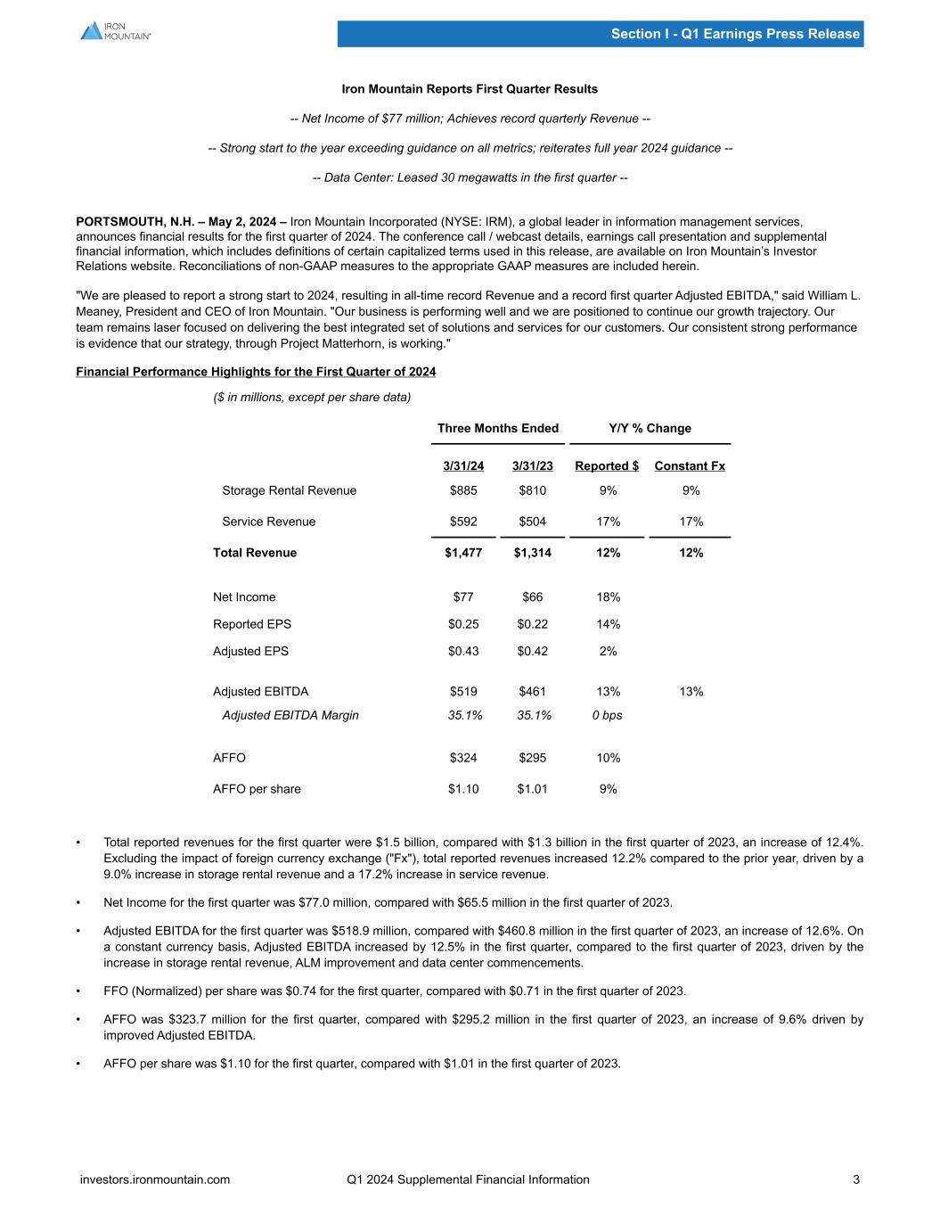 铁山公布第一季度业绩--净收入7700万美元;实现创纪录的季度收入---今年开局强劲,在所有指标上都超过了预期;重申2024年全年指引---数据中心:第一季度租赁量为30兆瓦--新罕布什尔州朴茨茅斯– 2024年5月2日–信息管理服务的全球领导者铁山公司(NYSE:IRM)公布2024年第一季度财务业绩。电话会议/网络直播的详细信息、收益电话会议演示文稿和补充财务信息,其中包括本新闻稿中使用的某些大写术语的定义,请访问铁山的投资者关系网站。非公认会计原则措施与适当的公认会计原则措施的调节包括在此。铁山总裁兼首席执行官William L. Meaney表示:“我们很高兴地报告2024年的强劲开局,带来了创纪录的收入和创纪录的第一季度调整后EBITDA。”"我们的业务表现良好,我们有能力继续我们的增长轨迹。我们的团队始终专注于为我们的客户提供最佳的集成解决方案和服务。我们一贯的强劲表现证明,我们的战略,通过马特宏峰计划,正在奏效。"2024年第一季度财务业绩亮点(百万美元,每股数据除外)截至三个月Y/Y %变化3/31/243/31/23报告的固定外汇存储租金收入885美元8109% 9%服务收入592美元50417% 17%总收入1477美元131412% 12%净收入77美元6618%报告的每股收益0.25美元0.22美元14%调整后每股收益0.43美元0.42%调整后EBITDA 519美元46113% 13%调整后EBITDA利润率35.1% 35.1% 0bps AFFO 324美元29510% AFFO每股1.10美元1.019% •第一季度报告的总收入为15亿美元,与2023年第一季度的13亿美元相比,增长了12.4%。剔除外币兑换(“FX”)的影响,报告总收入较上年增长12.2%,这主要得益于仓储租赁收入增长9.0%和服务收入增长17.2%。•第一季度净收入为7700万美元,而2023年第一季度为6550万美元。•第一季度调整后EBITDA为5.189亿美元,2023年第一季度为4.608亿美元,增长12.6%。按固定汇率计算,与2023年第一季度相比,第一季度调整后EBITDA增长了12.5%,这主要得益于存储租赁收入的增长、ALM的改善和数据中心的开工。•第一季度每股FFO(正常化)为0.74美元,而2023年第一季度为0.71美元。•第一季度AFFO为3.237亿美元,而2023年第一季度为2.952亿美元,在调整后EBITDA改善的推动下增长9.6%。•第一季度每股AFFO为1.10美元,而2023年第一季度为1.01美元。第一节-第一季度收益新闻稿投资者.ironmountain.com 2024年第一季度补充财务信息3