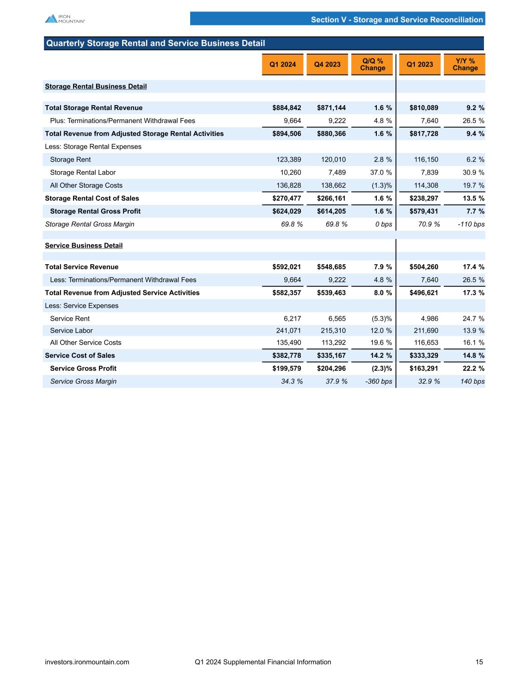 季度仓储租金和服务业务详情Q1 2024 Q4 2023 Q/Q %变化Q1 2023 Y/Y %变化存储租赁业务详情存储租赁总收入$ 884,842 $ 871,1441.6% $ 810,0899.2%加:终止/永久提款费9,6649,2224.8% 7,64026.5%调整后存储租赁活动总收入$ 894,506 $ 880,3661.6% $ 817,7289.4%减:存储租赁费用存储租金123,389120,0102.8% 116,1506.2%存储租赁人工10,2607,48937.0% 7,83930.9%所有其他存储成本136,828138,662(1.3)% 114,30819.7%存储租赁销售成本$ 270,477 $ 266,1611.6% $ 238,29713.5%仓储租赁毛利$ 624,029 $ 614,2051.6% $ 579,4317.7%仓储租赁毛利率69.8% 69.8% 0bps 70.9%-110 bps服务业务详情总服务收入$ 592,021 $ 548,6857.9% $ 504,26017.4%减:终止/永久提款费9,6649,224.8% 7,64026.5%调整后服务活动总收入$ 582,357 $ 539,4638.0% $ 496,62117.3%减:服务费用服务租金6,2176,565(5.3)% 4,98624.7%服务人工241,071215,31012.0% 211,69013.9%所有其他服务成本135,490113,29219.6% 116,65316.1%服务成本销售额$ 382,778 $ 335,16714.2% $ 333,32914.8%服务毛利$ 199,579 $ 204,296(2.3)% $ 163,29122.2%服务毛利率34.3% 37.9%-360 bps 32.9% 140 bps第V节-存储和服务和解投资者.ironmountain.com 2024年第一季度补充财务信息15