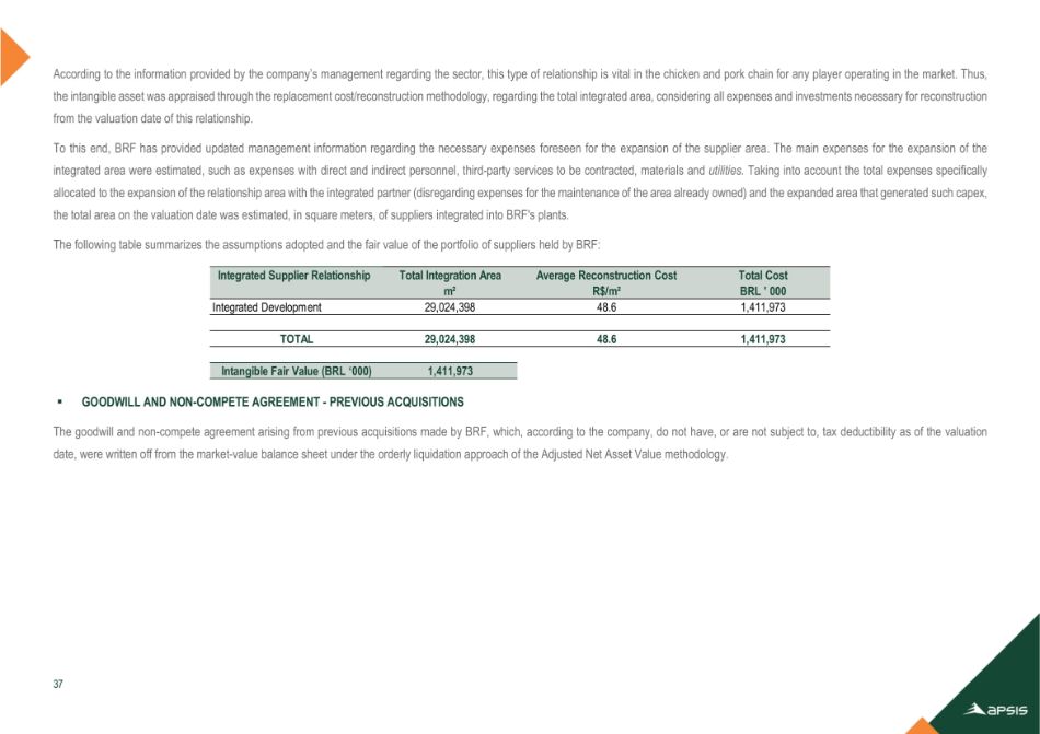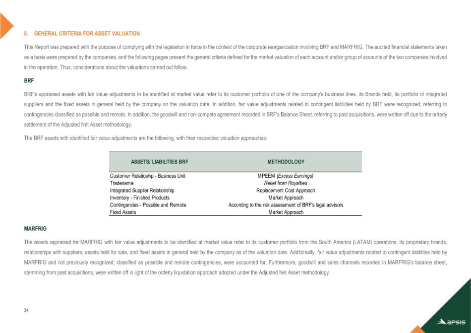 ▪估值标准–北美洲在对品牌的公允价值进行估值时采用了以下步骤,采用版税减免方法:o归属于品牌的收入–对于北美经济而言,19.51%的业务收入被认为是在评估品牌下产生的。o确定版税率−来自Markables和版税来源数据库以及内部APSIS数据库的信息,用于定位涉及在肉类行业运营的品牌的使用许可的交易。此外,对与无形资产相关的定性因素进行了评估。经过分析,得出的结论是,对预计的NOR适用0.6%的特许权使用费率。o所得税扣除−特许权使用费付款在资产的整个生命周期内按美国所得税税率扣除。使用了26.5%的税收减免,其中考虑了美国的所得税税率(21%),加上对收入征收的特拉华州税率(5.5%)。o贴现率的应用−版税储蓄以适当的回报率计入现值。我们确定了北美品牌的贴现率,等于北美地区MARFRIG运营的APSIS计算的WACC。o摊销的税收优惠−由于资产没有确定的使用寿命,因此在本分析中不被视为税收优惠。▪结论– NORTH AMERICA基于上述分析和附件3D中显示的计算,我们得出公允价值为1,249,209千雷亚尔,没有确定Am é rica do Norte品牌的使用寿命。3