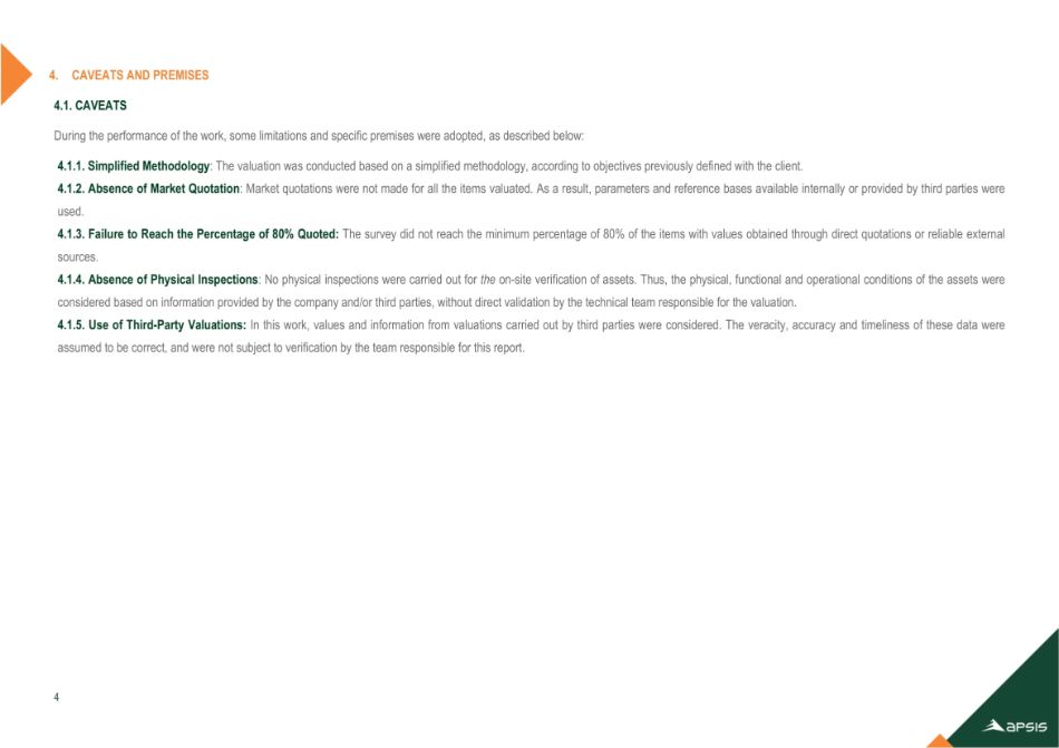 4.洞穴和房舍1。CAVEATS在执行工作过程中,采用了一些限制和特定前提,如下所述:1。简化方法:根据先前与客户定义的目标,根据简化方法进行估值。2.市场报价缺席:未对所有估价项目进行市场报价。因此,使用了内部可用或第三方提供的参数和参考基础,3。未达到80%被引用的百分比:调查未达到通过直接报价或可靠外部来源获得的数值的最低百分比为80%的项目。4.未进行实物核查:未对资产现场核查进行实物核查。因此,资产的物理、功能和运营条件是根据公司和/或第三方提供的信息考虑的,而无需由负责估值的技术团队直接验证。5.使用第三方估值:在这项工作中,考虑了第三方进行的估值的价值和信息。这些数据的真实性、准确性和及时性被假定为正确的,不受负责本报告的团队的核实。