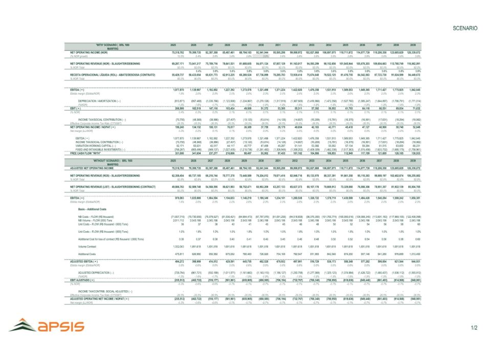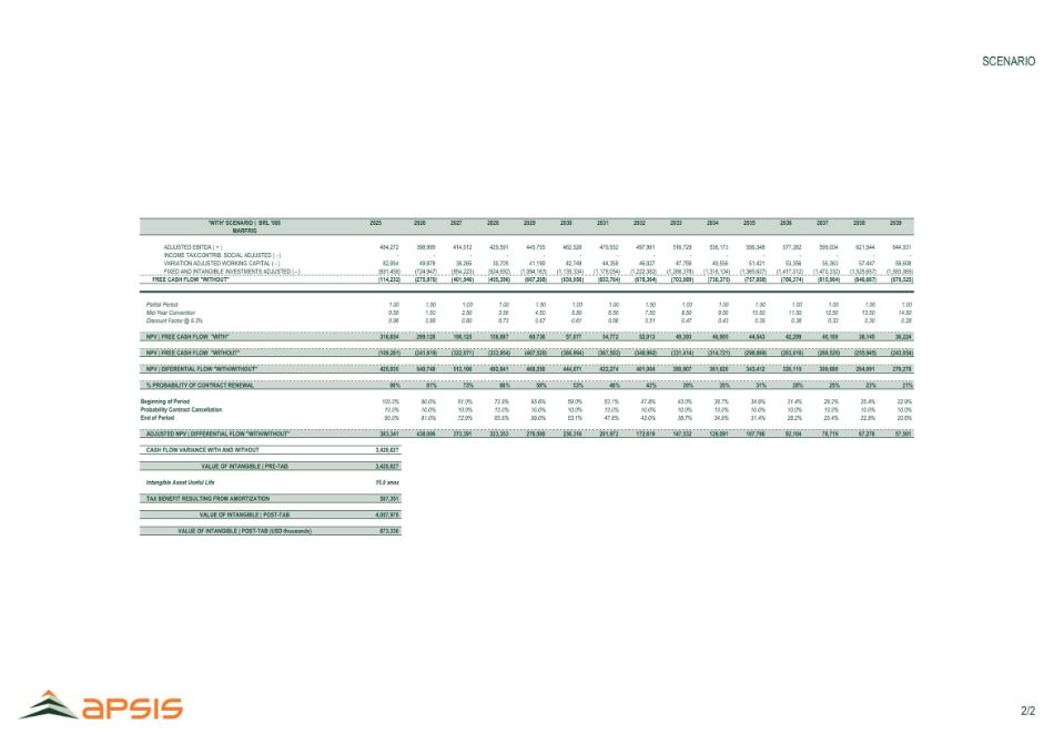 情景2039203820372036203520342033203220312031203020292028202720262025‘with’情景| BRL'000 MARFRIG 644,931621,54 4599,004577,282556,348536,173516,729497,991479,932462,528445,755429,591414,012398,999494,272调整后EBITDA(+)---------------所得税/抵押贷款。社会调整(-)59,60857,44755,36353,35651,42149,55647,75946,02744,35842,74941,19939,70538,26549,97882,954变动调整后营运资本(-)(1,583,065)(1,525,657)(1,470,332)(1,417,012)(1,365,627)(1,316,104)(1,268,378)(1,222,382)(1,178,054)(1,135,334)(1,094,163)(924,692)(854,223)(724,947)(691,458)固定和无形投资调整1.50 0.50年中常规0.28 0.30 0.33 0.36 0.39 0.43 0.47 0.5 10.56 0.6 10.67 0.73 0.80 0.88 0.96贴现因子@9.3% 36,22438,14540,16942,29944,54346,90549,39352,0 1354,77257,67760,736158,887190,125299,128316,654 NPV |自由现金流“与”(243,054)(255,945)(269,520)(283,816)(298,869)(314,721)(331,414)(348,992)(367,502)(386,994)(407,520)(333,954)(322,071)(241,619)(109,2873% 81% 90%%合同续期概率22.9% 25.4% 28.2% 31.4% 34.9% 38.7% 43.0% 47.8% 53.1% 59.0% 65.6% 72.9% 81.0% 90.0% 100.0%期初10.0% 10.0% 10.0% 10.0% 10.0% 10.0% 10.0% 10.0% 10.0% 10.0% 10.0% 10.0% 10.0% 10.0% 10.0% 10.0% 10.0% 10.0% 10.0% 10.0% 10.0% 10.0%概率合同解除20.6% 22.9% 25.4% 28.2% 31.4% 34.9% 38.7% 43.0% 47.8% 53.1% 59.0% 65.6% 72.9% 81.0% 90.0%期末57,50167,27878,71992,104107,766126,091147,532172,619anos无形资产使用寿命587,351摊销产生的税收优惠4,007,978无形资产价值| Post-TAB 673,338无形资产价值| Post-TAB(千美元)2/2