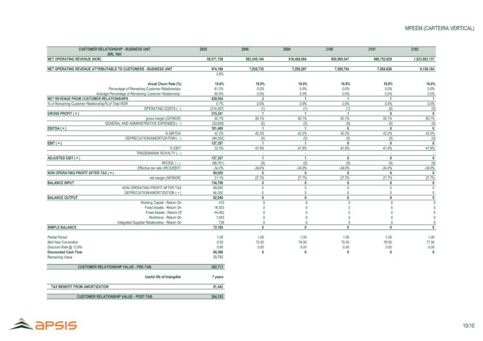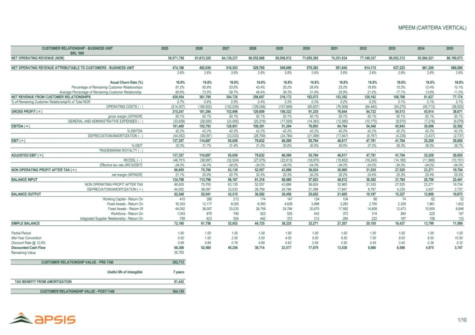 无形MPEEM(LATAM)20292028202720262025客户组合(BRL'000)26,273,87125,321,08924,402,85823,517,92522,665,084净营业收入(NOR)25,025,45424,117,94423,243,34322,400,45921,588,140归属于当期客户的净营业收入31.9% 31.9% 31.9% 31.9%年流失率(%)14.7% 21.5% 31.6% 46.4% 68.1%剩余客户关系占比18.1% 26.6% 39.0% 57.2% 84.1%平均占比2,976,269毛利润(=)16.4% 16.4% 16.4% 16.4% 16.4%毛利率(GP/NOR)(331,456)(469,022)(663,683)(939,134)(1,330,060)一般和行政费用(-)410,886581,417822,7261,164,1851,646,208 EBITDA(=)9.1% 9.1% 9.1% 9.1% EBITDA(96,793)(123,933)(158,441)(201,969)(224,078)折旧/摊销(-)314,093457,484664,285962,2161,422,131息税前利润(=)6.9% 7.1% 7.3% 7.5% 7.832.4%-32.4%-32.4%-32.4%有效税率(IRCS/EBIT)166,504244,417357,299520,614777,615税后非经营利润(=)3.7% 3.8% 3.9% 4.1% 4.3%净利率(NP/NOR)263,297368,350515,740722,5831,001,693余额输入166,504244,417357,299520,614777,615税后非经营利润96,793123,933158,441201,969224,078折旧/摊销(+)145,642192,214254,156336,452412,48711,210劳动力-回报率117,655176,136261,584386,131589,206简单余额1.00 1.00 1.00 1.00 1.00部分期间4.50 3.50 2.50 1.50 0.50年中惯例0.58 0.65 0.74 0.83 0.94贴现率@12.9% 68,245115,311193,286322,024554,607折现现金流114,294剩余价值1,367,766客户关系价值-pre-TAB 5年使用寿命无形439,210摊还税后收益1,806,977客户关系价值-post-tab 4/4