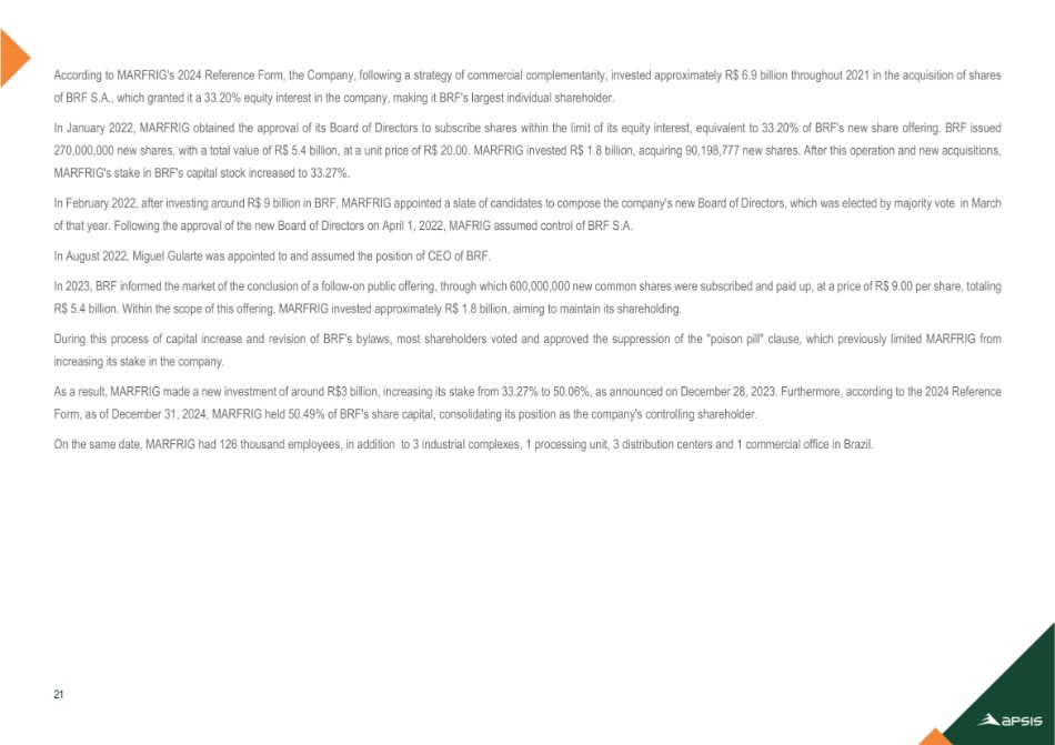 | (e) | 2025年4月25日,BRF董事会(“BRF板”,并与Marfrig董事会一起,“董事会”)批准组建BRF特别独立委员会(“BRF独立委员会”,并与Marfrig独立委员会一起,“独立委员会”),并根据2008年9月1日CVM第35号指导意见(“CVM指导意见35”);以及 |