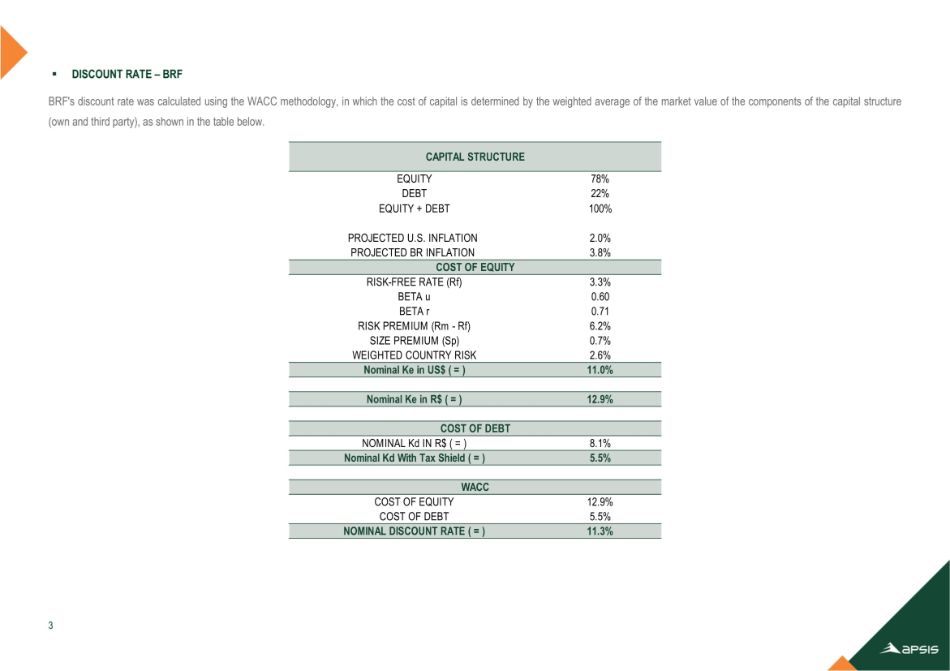 根据MAFRIG管理层的信息,出于估值目的,这些品牌被细分为增值品牌(评估品牌)和非增值或第三方品牌。此外,还根据归属于这些品牌中的每一个品牌的收入的代表性进行了比例分配。下面,我们给出各被评估品牌的收入代表性。o南美:被评估的品牌,合计约占公司LATAM收入的76.73%。o北美:被评估的品牌,合计约占公司北美收入的19.51%。▪估值标准–南美洲在对品牌的公允价值进行估值时采用了以下步骤,使用版税减免方法:o归属于品牌的收入–对于the ul,76.73%的业务收入被认为是在评估品牌– LATAM下产生的。o确定版税率−来自Markables和版税来源数据库以及内部APSIS数据库的信息,用于定位涉及肉类和家禽食品领域品牌的使用许可交易。此外,对与无形资产相关的定性因素进行了评估。经过分析,得出的结论是,对预计的NOR适用2.0%的特许权使用费税率。o所得税扣除−特许权使用费付款在资产的整个生命周期内按美国加权所得税税率扣除。使用了32.4%的税收减免,阿根廷、巴西、智利和乌拉圭之间的加权费率。o贴现率的应用−版税储蓄以适当的收益率计入现值。我们确定了LATAM品牌的贴现率等于APSIS为LATAM业务计算的WACC。o摊销的税收优惠−由于资产没有确定的使用寿命,因此在本分析中不将其视为税收优惠。▪结论–南美洲根据上述分析和附件3D中显示的计算,我们得出的公允价值为2,674,617千雷亚尔,没有确定的MAFRIG的LATAM品牌的使用寿命。2