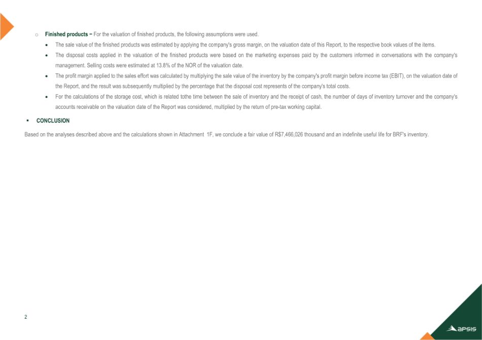 o制成品−对于制成品的估值,采用以下假设。制成品的销售价值乃按公司于本报告估值日的毛利率,分别按项目各自的帐面价值估计。在对成品进行估值时应用的处置成本是基于客户在与公司管理层的谈话中告知支付的营销费用。销售成本预估为3.4%。应用于销售努力的利润率是通过将存货的销售价值乘以公司在报告估值日的所得税前利润率(EBIT)计算得出的,结果随后乘以处置成本占公司总成本的百分比。对于仓储成本的计算,考虑了报告估值日存货周转天数和公司应收账款与销售存货到收到现金之间的时间,乘以税前营运资金的返还。▪结论根据上述分析和附件3F中的计算,我们得出MAFRIG存货的公允价值为3,432,154千雷亚尔,使用寿命不确定。2