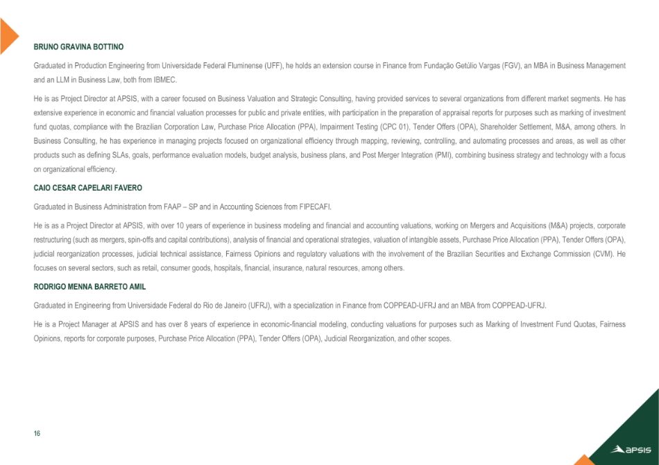 | 4.1 | 评估公司.两家公司的管理层已聘请Apsis Consultoria Empresarial Ltda.,该公司根据编号08.681.365/0001-30在CNPJ/MF注册,并根据编号005112/O-9在里约热内卢地区会计委员会(CRC/RJ)注册,其注册办事处位于里约热内卢州里奥市Rua do Passeio,on Rua do Passeio,n º 62,6 º andar,Centro,CEP 20021-290,(“评估公司"),作为负责编制评估报告(定义见下文第4.5条) |