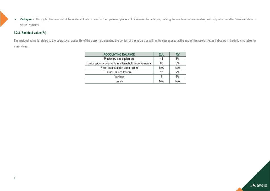 ▪崩溃:在这个循环中,发生在操作阶段的物质的清除达到崩溃的高潮,使机器无法恢复,只剩下所谓的“残存状态或价值”。5.2.3.剩余价值(PR)剩余价值与资产的运营使用寿命相关,代表在该使用寿命结束时不会折旧的价值部分,如下表所示,按资产类别:8 RV EUL会计余额5% 14机械设备5% 60建筑物、改善和租赁物改良不适用不适用在建固定资产2% 13家具和固定装置5% 5车辆不适用不适用土地