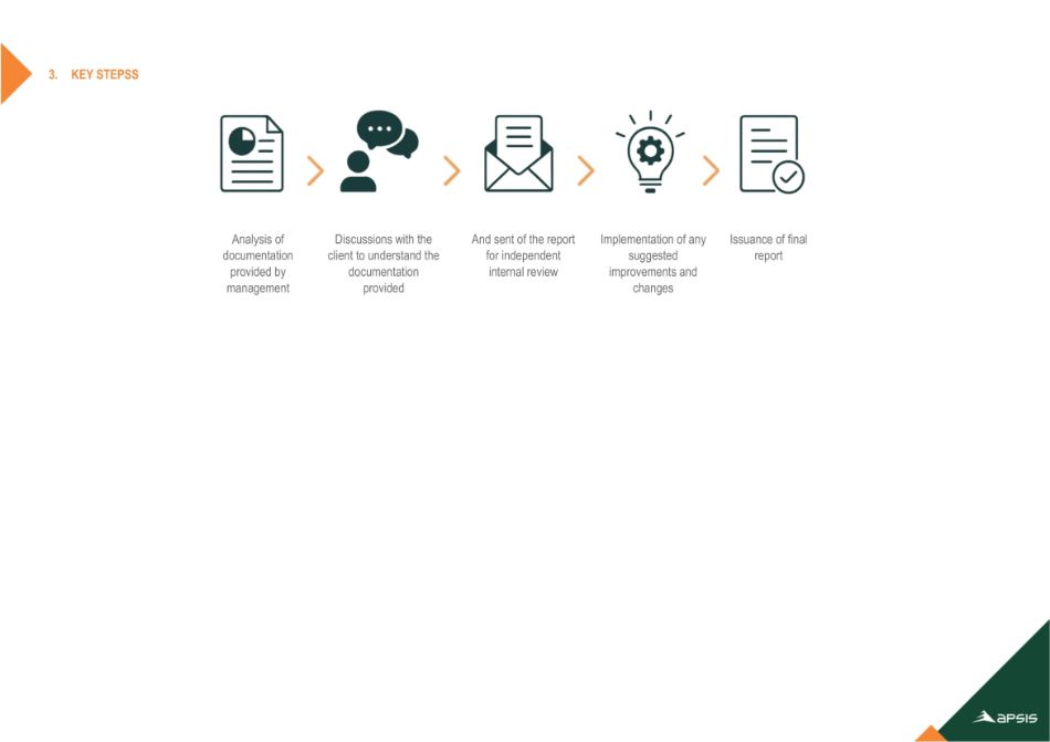 3.关键步骤分析管理层提供的文件与客户进行讨论,以了解为独立内部审查提供和发送报告的文件执行任何建议的改进和更改发布最终报告