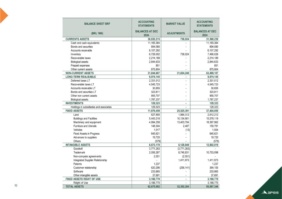 Balan ç o CONSOLIDADO BRF会计报表市场价值调整会计报表资产负债表BALF BRF(BRL'000)2024年12月余额2024年12月余额31,568,239738,0 2430,830,215流动资产11,165,364-11,165,364现金及现金等价物894,080-894,080债券和证券6,107,292-6,107,292应收账款7,466,026738,0246,728,002存货2,214,189-2,214,189可收回税款2,844,633-2,844,633生物资产851-851预付费用875,804-875,804其他流动资产63,499,10731,654,24031,844,867非流动资产9,974,145-9,974,145长期可实现2,331,012-2,331,012递延税款LT 4,545,723-4,545,723可收回税款LT 30,655-30,655应收账款LT 323,811-323,811债券和证券LT及联营公司37,404,85025,525,39111,879,459固定资产2,612,2121,984,312627,900土地15,578,11910,134,9015,443,218房屋及设施18,397,96213,403,7044,994,258机械设备150,7912,487148,304家具及用具1,004(13)1,017辆车645,621-645,621在手固定资产19,720-19,720预付供应商款项(579)-(579)其他12,802,0 196,128,8496,673,170无形资产-(3,771,263)3,771,263商誉10,753,0988,746,8312,006,267商标-(2,551)2,551非竞争协议1,411,9731,411,973-集成供应商关系1,237-1,237专利364,155(256,141)620,296客户关系233,865-233,865软件37,691-37,691其他无形资产3,188,770-3,188,7