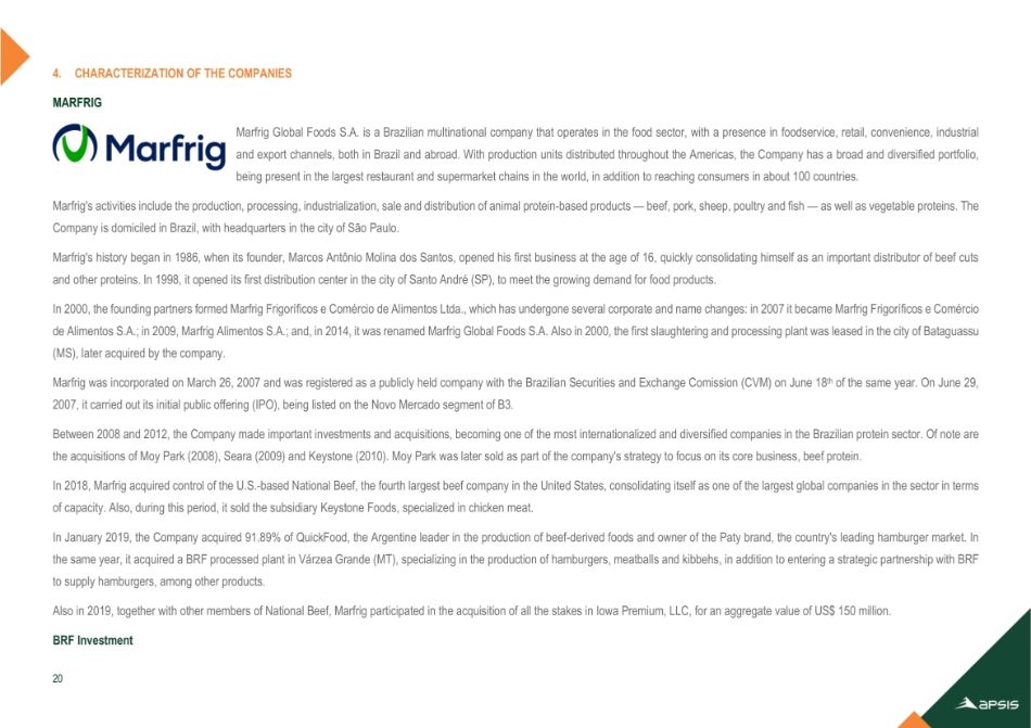 | (2) | BRF S.A。,一家上市公司,其注册办事处位于圣卡塔琳娜州Itaja í市,地址为Rua Jorge Tzachel,475,Fazenda Neighborhood,CEP88301-600,根据第01.838.723/0001-27号在CNPJ/MF注册,根据其章程("BRF”,并与Marfrig一起,“公司”或“缔约方”) |
