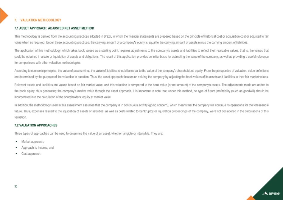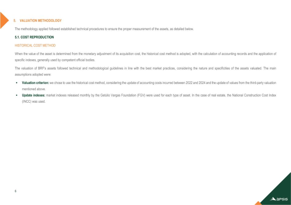 5.估值方法所应用的方法遵循既定的技术程序,以确保资产的正确计量,详情如下。1.成本再现历史成本法当资产的价值由其购置成本的货币调整确定时,采用历史成本法,并结合会计记录的计算和具体指数的应用,一般由官方主管机构采用。考虑到被估值资产的性质和特殊性,BRF资产的估值遵循了符合最佳市场实践的技术和方法准则。采用的主要假设是:▪估值标准:我们选择使用历史成本法,考虑了2022-2024年间发生的会计成本的更新以及上述第三方估值的价值更新。▪更新指数:Get ú lio Vargas基金会(FGV)每月发布的市场指数用于每类资产。在房地产方面,使用了全国建筑成本指数(INCC)。6