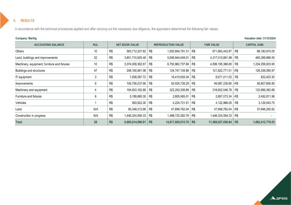 6.结果根据所应用的技术程序并在进行必要的尽职调查后,评估师确定了以下公允价值:资本收益公允价值复制值账面净值rul会计余额88,180,915.05R $ 671,893,442.87 R $ 1,002,804,791.31 R $ 583,712,527.82 R $ 10 Others 465,299,966.50 R $ 4,317,010,891.98 R $ 5,006,944,049.01 R $ 3,851,710,925.48 R $ 52 Land,buildings and improvements 1,224,256,003.93 R $ 4,599,195,366.60 R $ 6,750,962,737.66 R $ 3,374,939,362.67 R $ 10家具和固定装置126,338,0 90.97-R $ 121,822,771.01 R $ 124,747,104.88 R $ 248,160,861.98 R $ 47建筑物和构筑物832,423.30 R $ 8,671,0 11.02 R $ 16,419,059.34 R $ 7,838,587.72 R $ 3 IT设备56,807,806.85-R $ 49,987,230.80 R $ 50,024,728.29 R $ 106,795,037.66 R $ 6改进133,999,383.89 R $ 318,602,546.78 R $ 322,250,208.89 R $ 184,603,162.89 R $ 4机械和设备2,492,811.96-R $ 2,697,073.34 R $和固定装置3,129,043.75 R $ 4,122,966.05 R $ 4,224,721.51 R $ 993,922.30 R $ 1 Vehicles 37,646,250.62-R $ 47,699,762.04 R $ 47,699,762.04 R $ 85,346,012.66 R $ N/A Land-R $ 1,446,324,594.33 R $ 1,488,722,28 2.76 R $ 1,446,324,594.33 R $ N/A在建工程1,692,412,776.03 R $ 11,588,027,656.84 R $ 14,817,605,0 10.70 R $ 9,895,614,880.81 R $ 28 Total Company:Marf