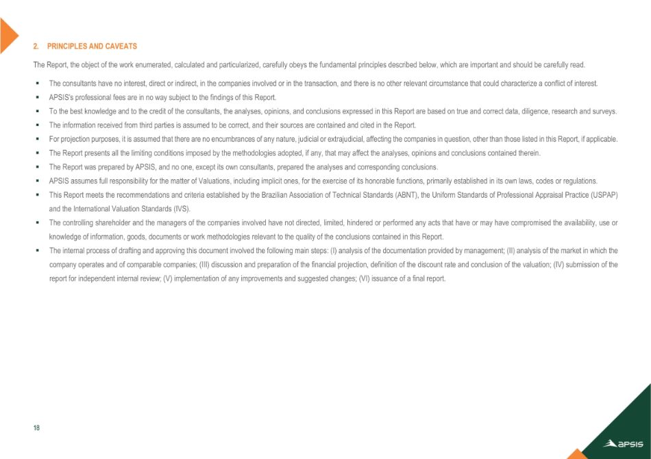 | 4.1.2 | 评估公司声明。评估公司已声明:(i)根据巴西联邦会计委员会制定的专业标准,它不知道任何直接或间接的利益冲突,也不知道与其所提供的服务有关并在合并评估报告(定义见下文)中描述的代表利益冲突的任何其他情况;(ii)它不知道控股股东或公司的管理人员采取了任何旨在指导、限制、阻碍或执行任何可能损害访问、使用、或了解相关信息、资产、文件或工作方法,以提高各自结论的质量。评估公司是基于其在准备这种性质的评估和评估方面的广泛而知名的经验而被选为本合并方案中所述工作的。 |