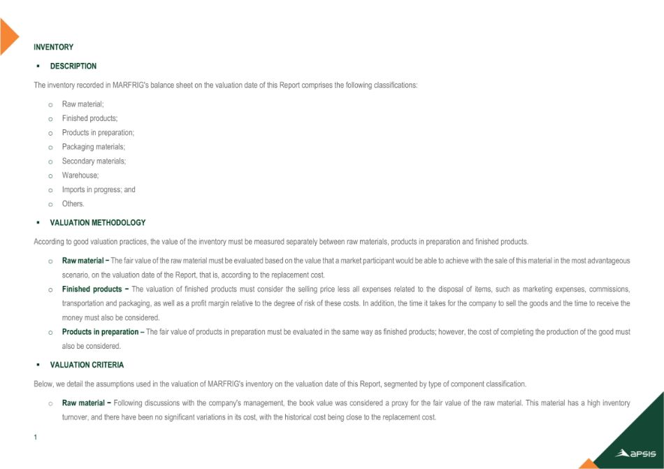 存货▪描述本报告估值日记录在MAFRIG资产负债表中的存货包括以下分类:o原材料;o产成品;o在制品;o包装材料;o二次材料;o仓库;o在制品进口;以及o其他。▪估值方法根据良好的估值惯例,存货的价值必须在原材料、准备中的产品和成品之间分别计量。o原材料−原材料的公允价值必须根据市场参与者在最有利的情况下销售这种材料能够实现的价值进行评估,在报告的估值日期,即根据重置成本。o成品−成品估值必须考虑售价减去与处置物品有关的所有费用,如营销费用、佣金、运输和包装,以及相对于这些成本的风险程度的利润率。此外,还必须考虑企业销售商品所需的时间和收到款项的时间。o在制品–在制品的公允价值必须与制成品一样进行评估;但也必须考虑完成商品生产的成本。▪下面的估值标准,我们详细介绍了在本报告估值日对MAFRIG存货进行估值时所使用的假设,按组件分类类型进行了细分。o原材料−在与公司管理层讨论后,账面价值被视为原材料公允价值的代表。该材料存货周转率较高,其成本未出现明显变化,历史成本接近重置成本。1