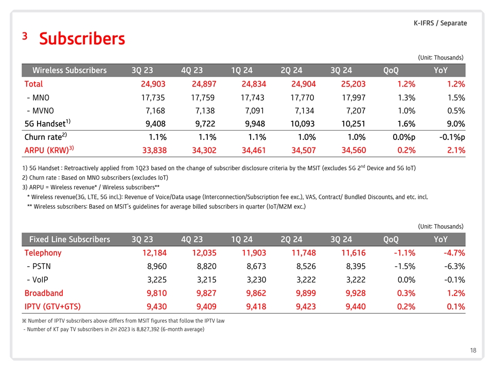 K-IFRS/单独3个用户(单位:千)无线用户3Q23 4Q23 1Q24 2Q24 3Q24 Q24 QoQ YoY合计24,90324,89724,83424,90425,2031.2% 1.2%-MNO17,73517,75917,74317,77017,9971.3% 1.5%-MVNO7,1687,1387,0917,1347,2071.0% 0.5% 1)5G手机9,4089,7229,94810,09310,2511.6% 9.0% 2)流失率1.1% 1.1% 1.1% 1.0% 1.0% 1.0% 0.0% p-0.1 % p 3)34,5600.2% 2.1% ARPU(KRW)33,83834,30234,46134,507 nd 1)5G手机:根据MSMS更改用户披露标准追溯自1Q23起应用设备和5G物联网)2)流失率:基于MNO用户(不包括物联网)3)ARPU =无线收入*/无线用户***无线收入(5G、LTE、5G包括):语音/数据使用收入(互连/订阅费不包括)、增值服务、合约/捆绑折扣、等包括。**无线用户:基于MSIT季度平均计费用户指引(物联网/M2M不包括)(单位:千)固话用户Q3 23 Q4 23 Q1 24 Q2 24 Q3 24 Q24 Q24 Q24 Q24 QoQ 24 YoY电话12,18412,03511,90311,74811,616-1.1 %-4.7 %-PSTN 8,9608,8208,6738,5268,395-1.5 %-6.3 %-VoIP 3,2253,2153,2303,2223,2220.0%-0.1 %宽带9,8109,8279,8629,8999,9280.3% 1.2% IPTV(GTV + GTS)9,4309,4099,4189,4239,4400.2% 0.1% *以上IPTV用户数量与MSIT数据不同遵循IPTV法的国家-2023年2H的KT付费电视用户数量为8,827,392(6个月平均)18